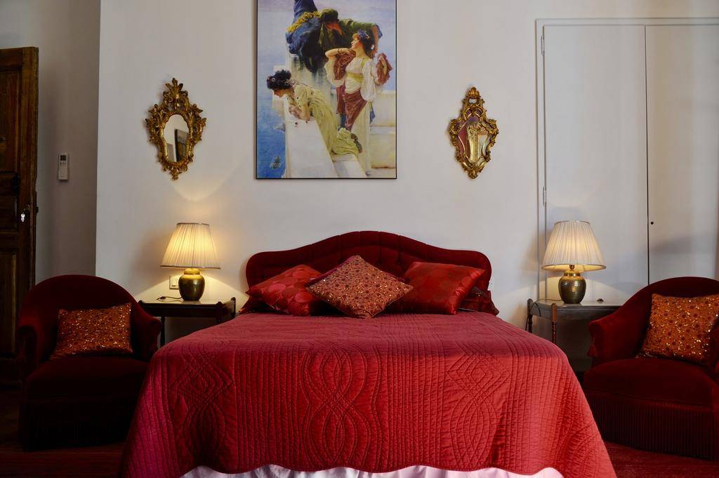 La Suite Automne : La Suite Automne (ou Suite Aragon), de 85m2 se situe au 1er étage. Décor rétro pour évoquer la période à laquelle le poète y séjourna, avec une touche de Baroque . Antichambre avec lit en 140cm et chambre principale avec lit en 180cm. Double porte de séparation entre les deux. Salle de bain complète, 2 WC, et terrasse privée avec vue sur la forteresse de Villeneuve lez Avignon : le Fort Saint André. Accès direct à la piscine - Climatisation - WIFI
