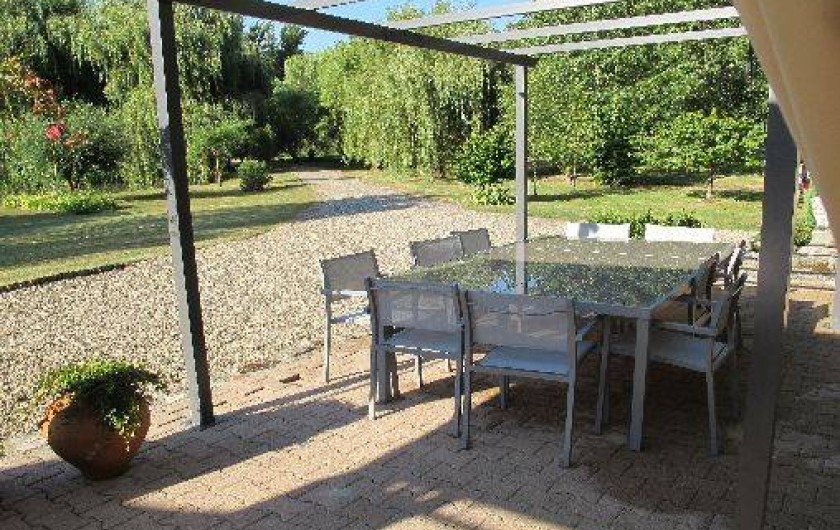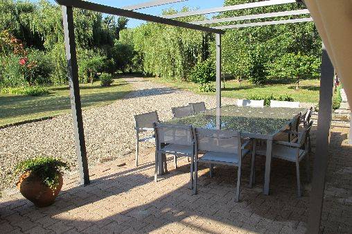 Cette terrasse comprend salon de jardin,parasol,chaises longue.