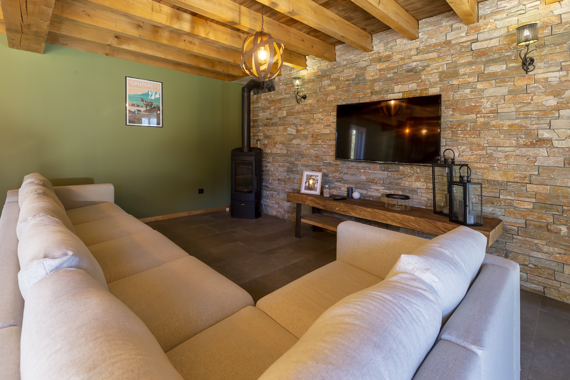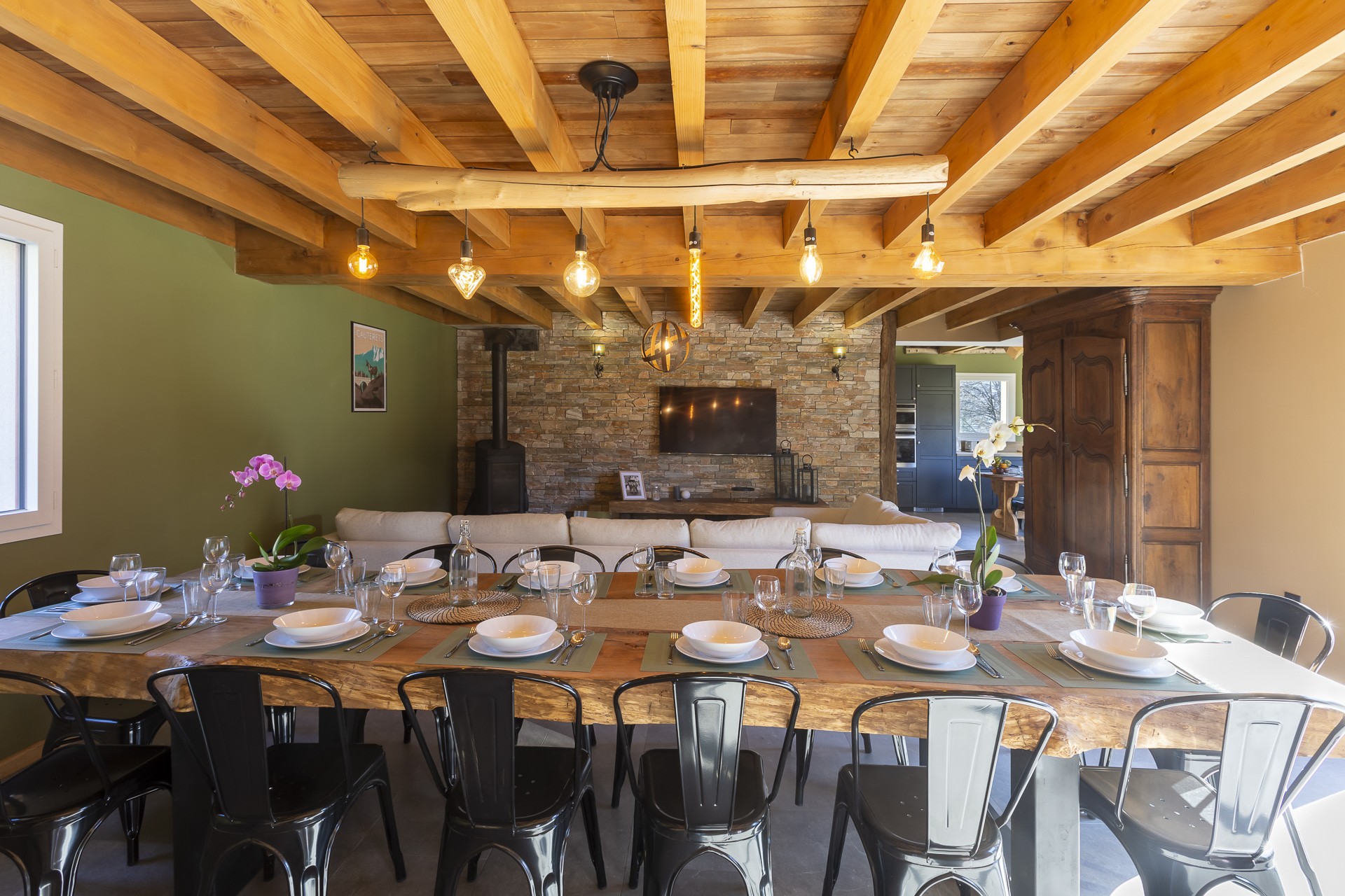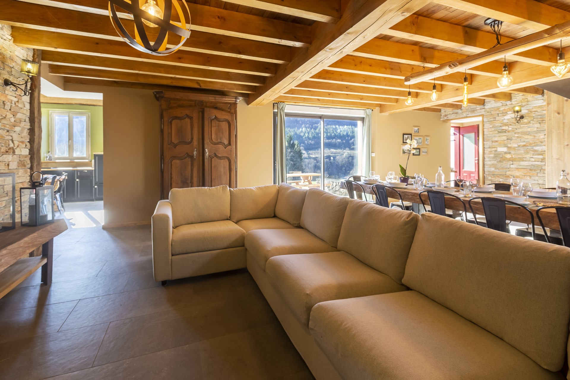 y a 4 chambres avec lits doubles, un chambre avec deux lits simples et une chambre dite "dortoir" avec 4 couchages. 3 salles de bains sont également à disposition des voyageurs ainsi qu'un cellier et une grande pièce de vie avec cuisine entièrement équipée et fonctionnelle. Vous ne pourrez vous lasser de la magnifique vue sur les montagnes depuis la cuisine. De plus, un espace extérieur et aménagé avec grande table et barbecue.