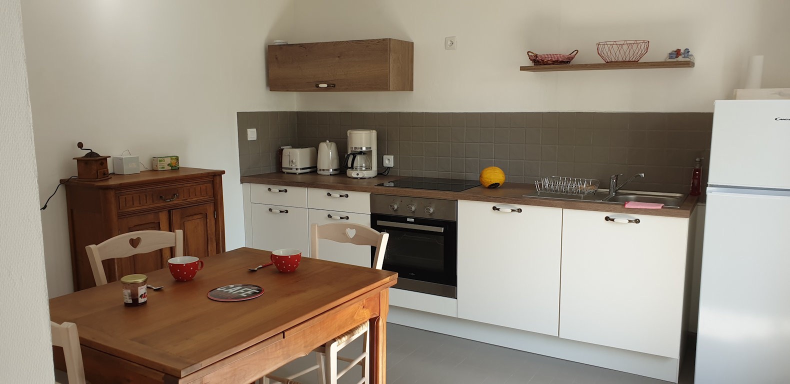 Cuisine avec plaques vitro, four, frigo avec compartiment congélateur