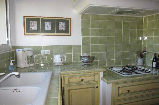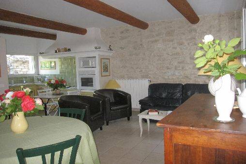 - Pièce commune de 35 M2 avec cuisine équipée (four traditionnel, plaque de cuisson, réfrigérateur, lave vaisselle, four micro onde), grandes baies vitrées avec accès à la cour, placards. Télévision