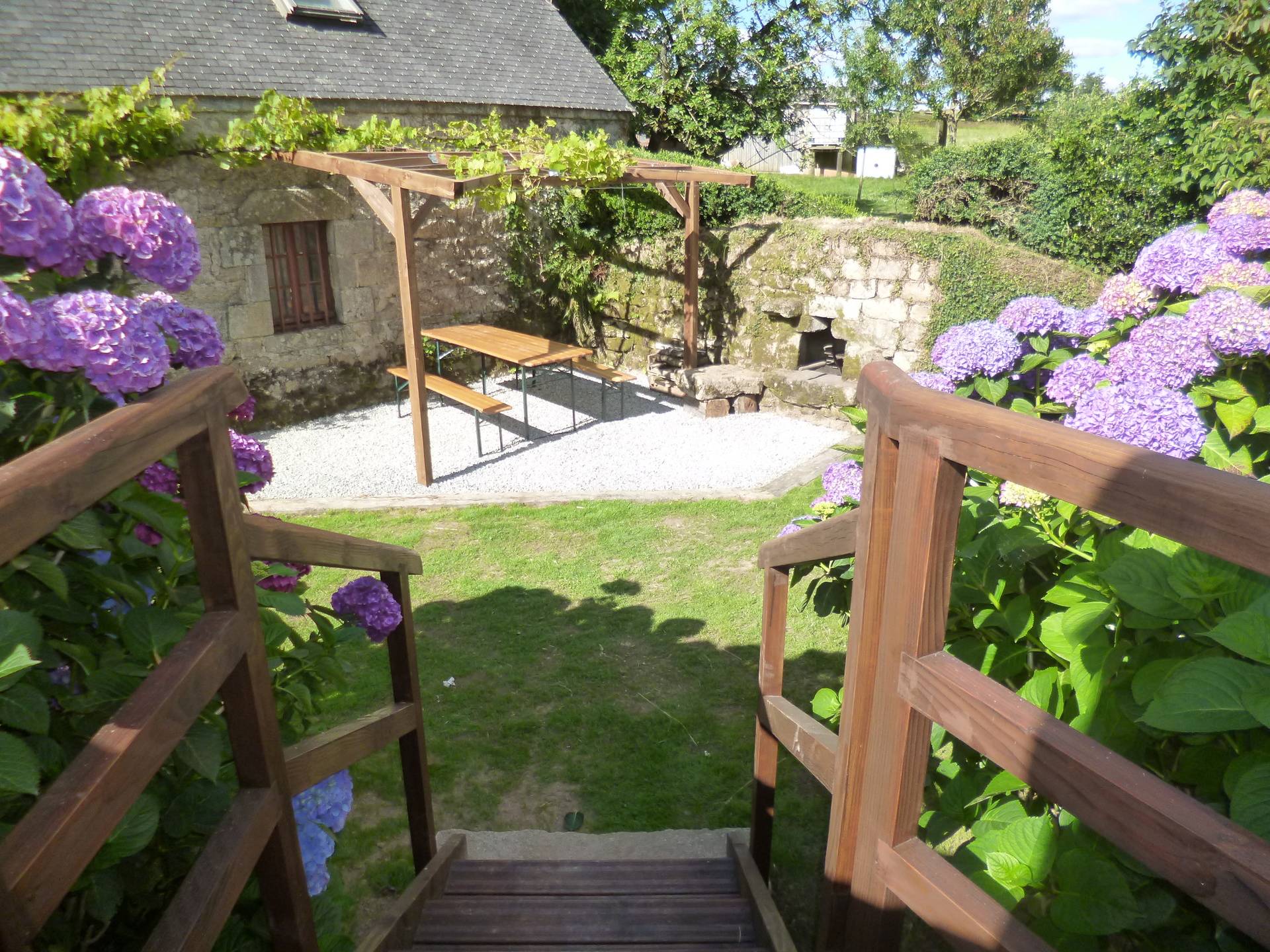 Gazon et hortensias ,Pergola de 9 m2 avec table et chaises , transats ,four en pierres pour barbecue.