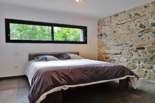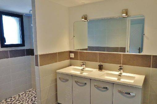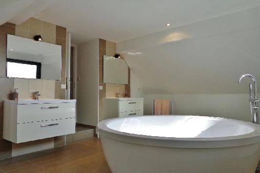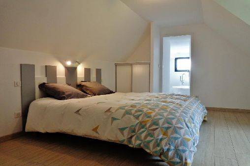 A l'étage, 1 chambre (lit 140) et sa salle d'eau privative, 1 chambre 2 lits 90 (modulables en 180) + 1 lit 90 et sa grande salle de bain privative.