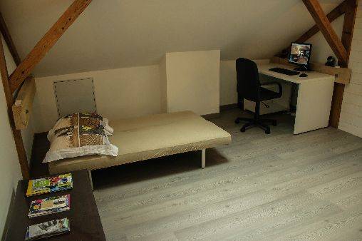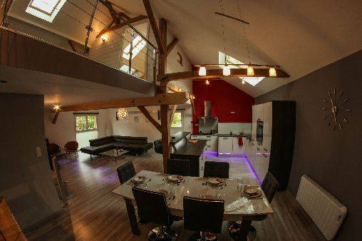 chambre mansardée, d’un toilette individuel, d’une salle de bain spacieuse équipée d’une douche italienne, ainsi que d’une cuisine ouverte sur le salon, séjour, et salle à manger.