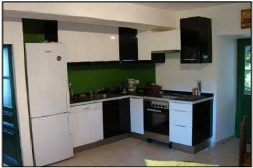 Une petite cuisine : réfrigérateur-congélateur, lave-vaisselle, cuisinière avec plaque gaz et four électrique