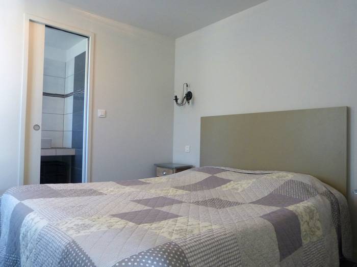 Gîte les Vignes 4 personnes (50m2), cuisine équipée salle à manger, deux chambres avec lit en 160 ou 2x80, douche et wc dans chaque chambre, grande terrasse privative sans vis à vis.