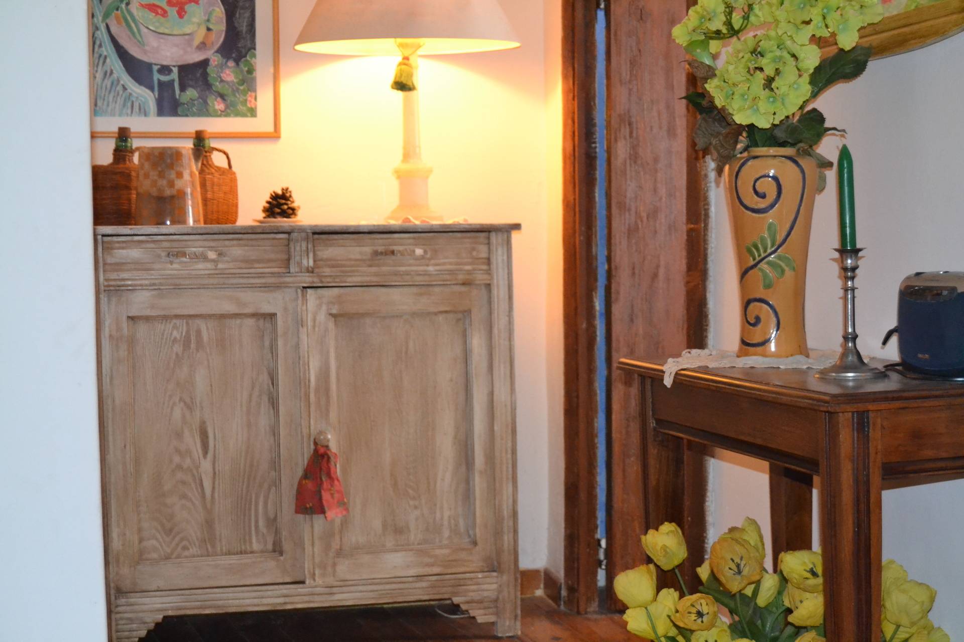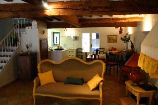 grande pièce (45 m2 ) salon avec cheminée -TV &LECTEUR DVD- deux banquettes -salle à manger buffet-placard avec tout le nécessaire vaisselle -Chaine Hi-Fi
