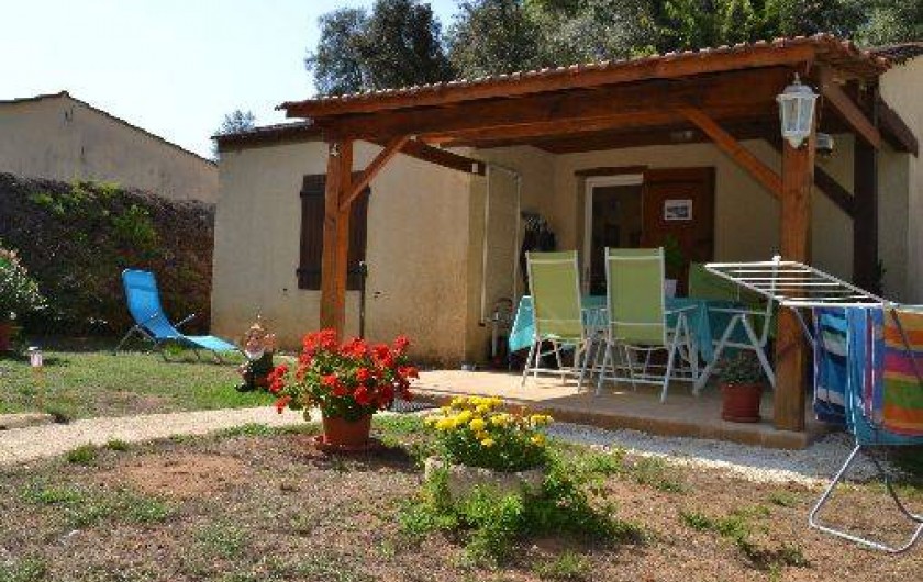 Terrasse couverte avec mobilier de jardin et barbecue.