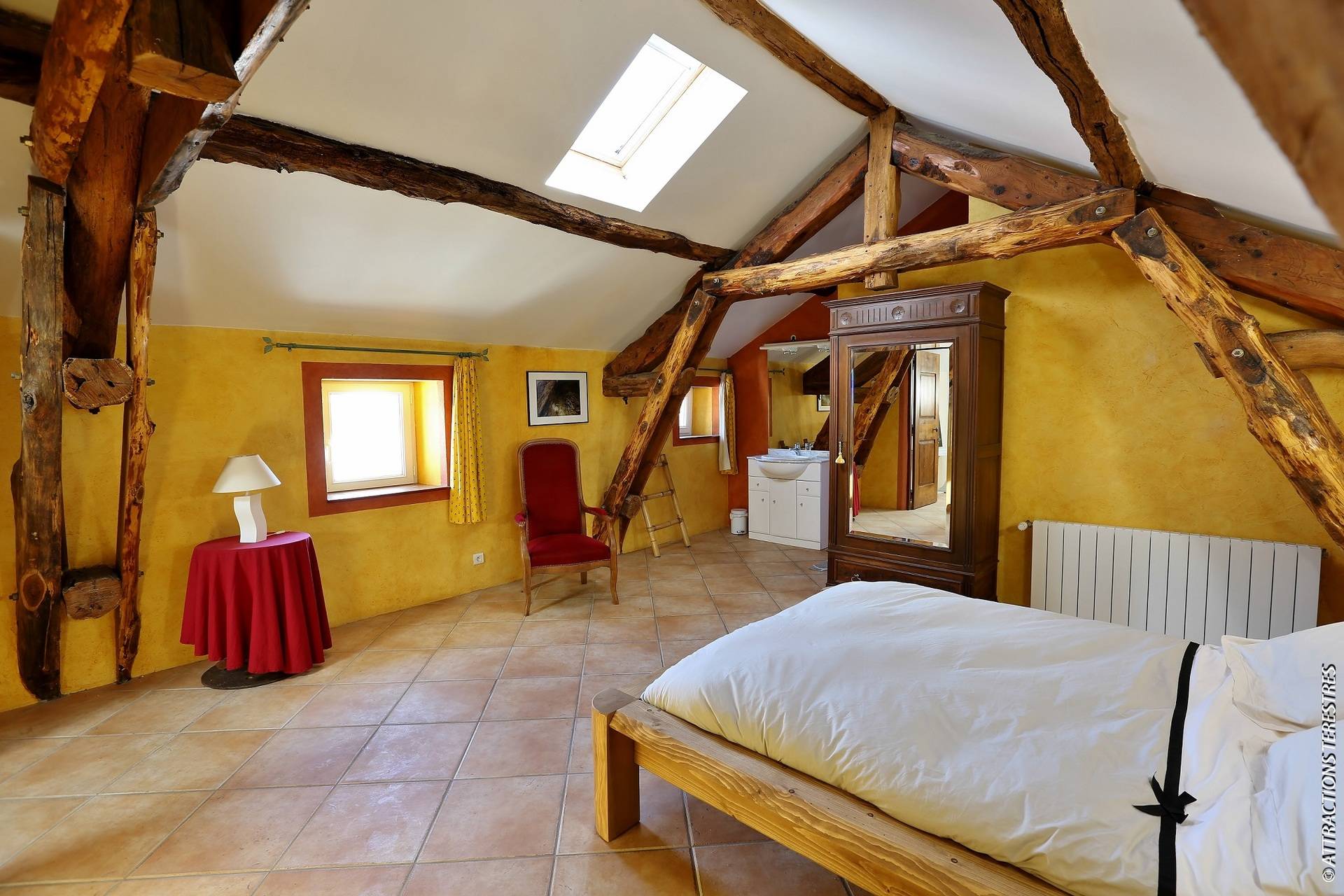 Implanté au milieu de 3 hectares de prairies, le bâtiment de caractère, orienté plein sud, est un corps de ferme entièrement rénové, modulable en deux configurations de gîtes d’une capacité de 8 à 10 personnes allant jusqu'à 12/15 personnes.