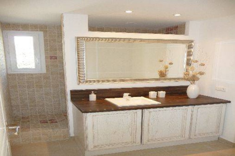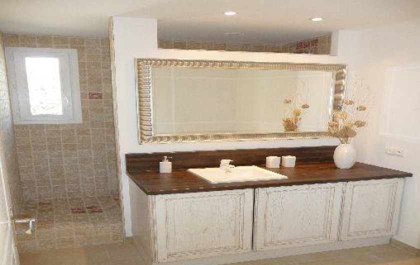 1 salle de bain moderne, avec vasque, douche à l’italienne en pierre de Travertin, un sèche-serviettes, machine à laver, WC.