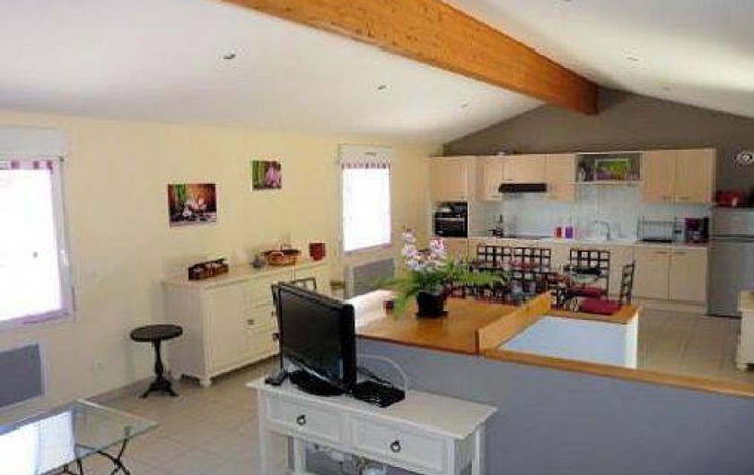 • Étage : coin cuisine entièrement équipée, lave-vaisselle, four multifonctions - micro-ondes, réfrigérateur-congélateur. Coin salon, TV, lecteur DVD, 2 banquettes convertibles 1 personne.