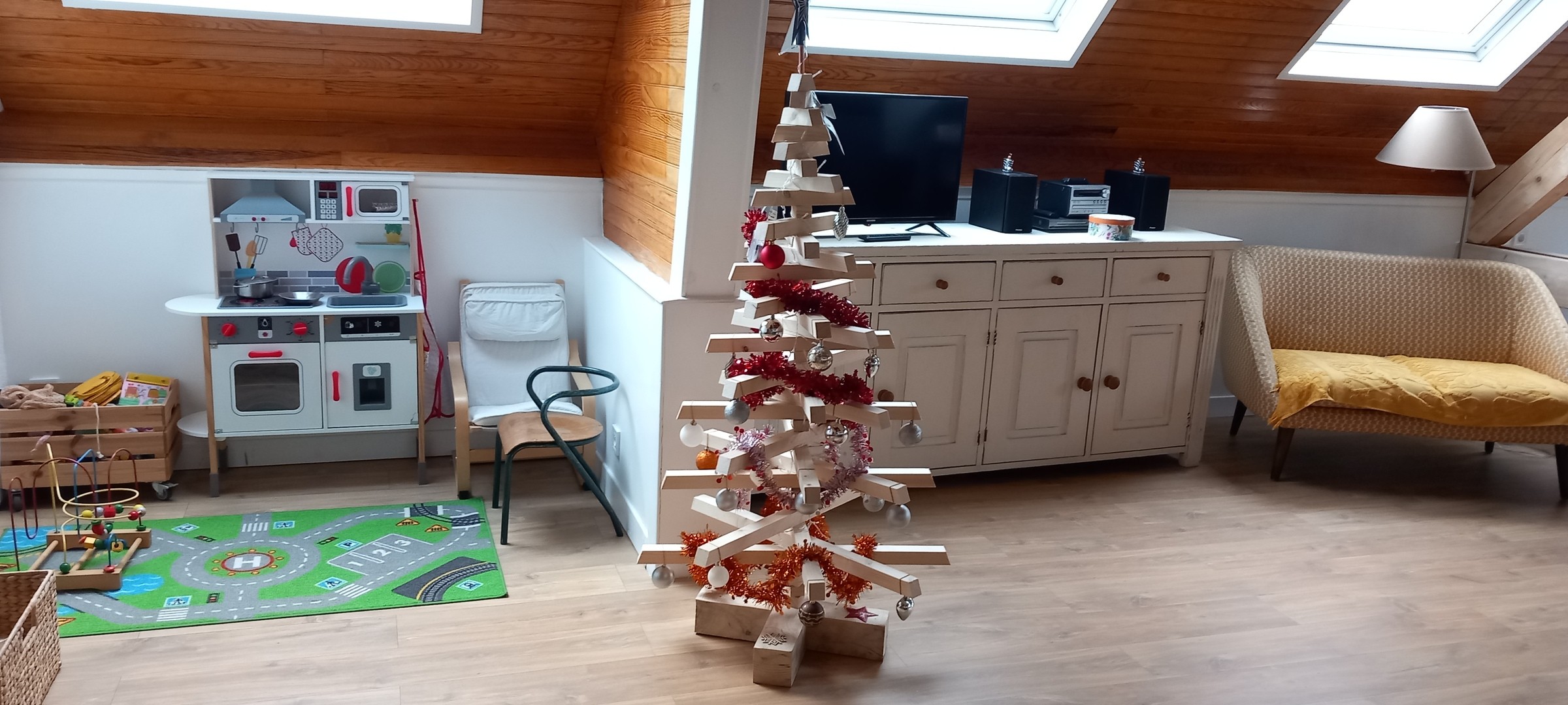 - cuisine ouverte : toute équipée ( lave vaisselle ; table de cuisson 5 feux, four ; machine a café ; micro onde ; TV ; appareil a raclette ; fondue ; grille pain etc...)