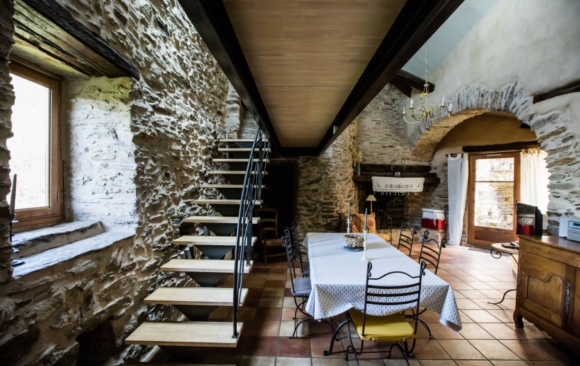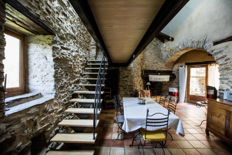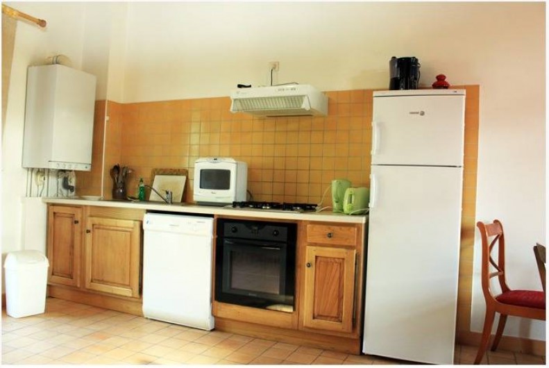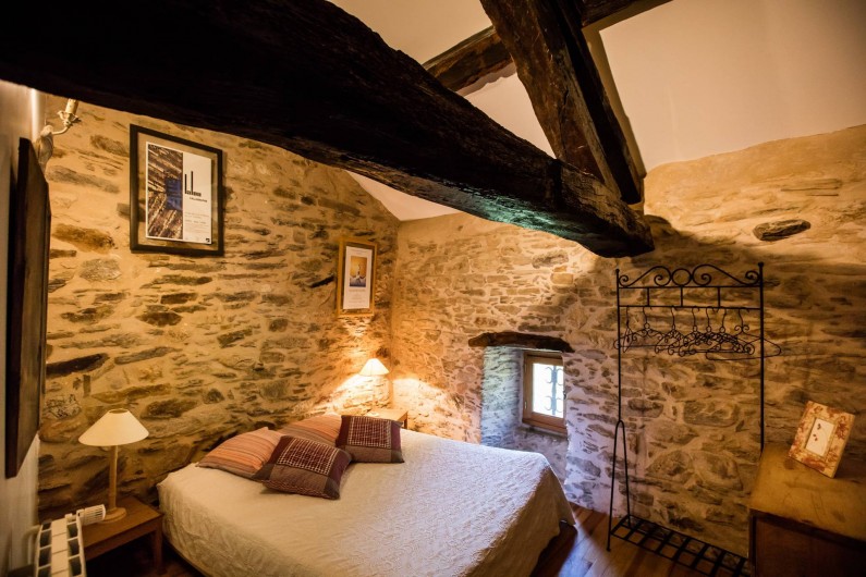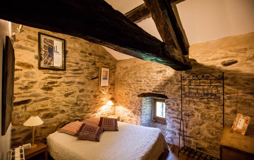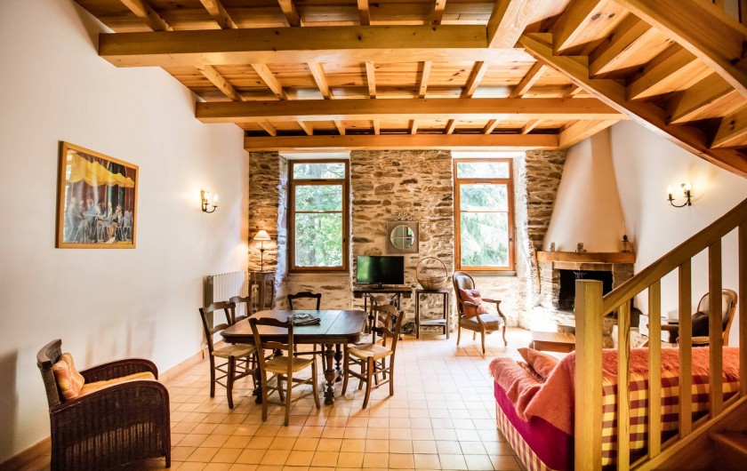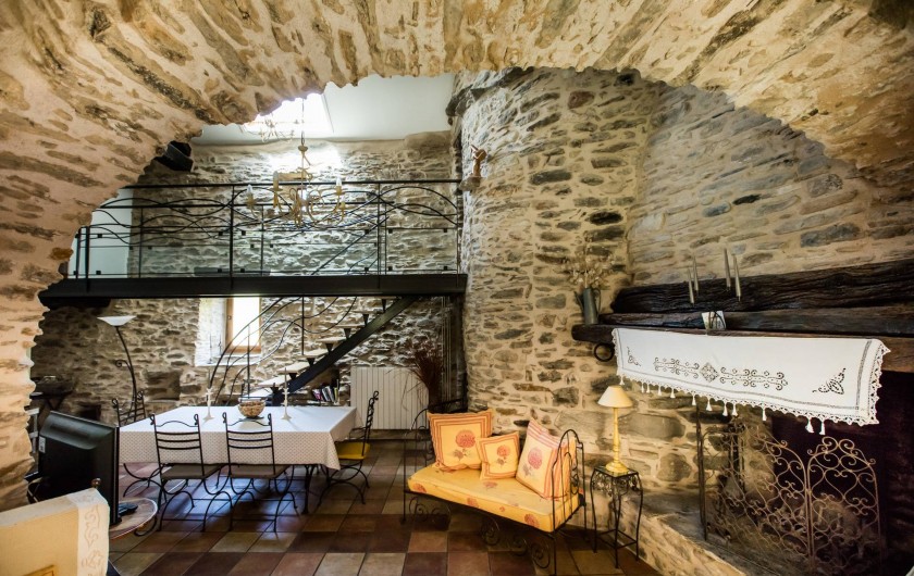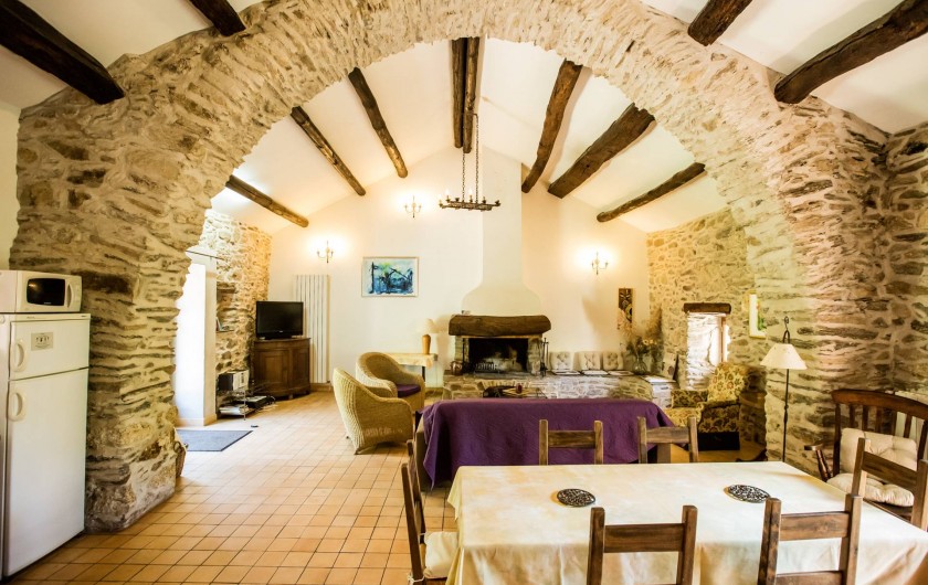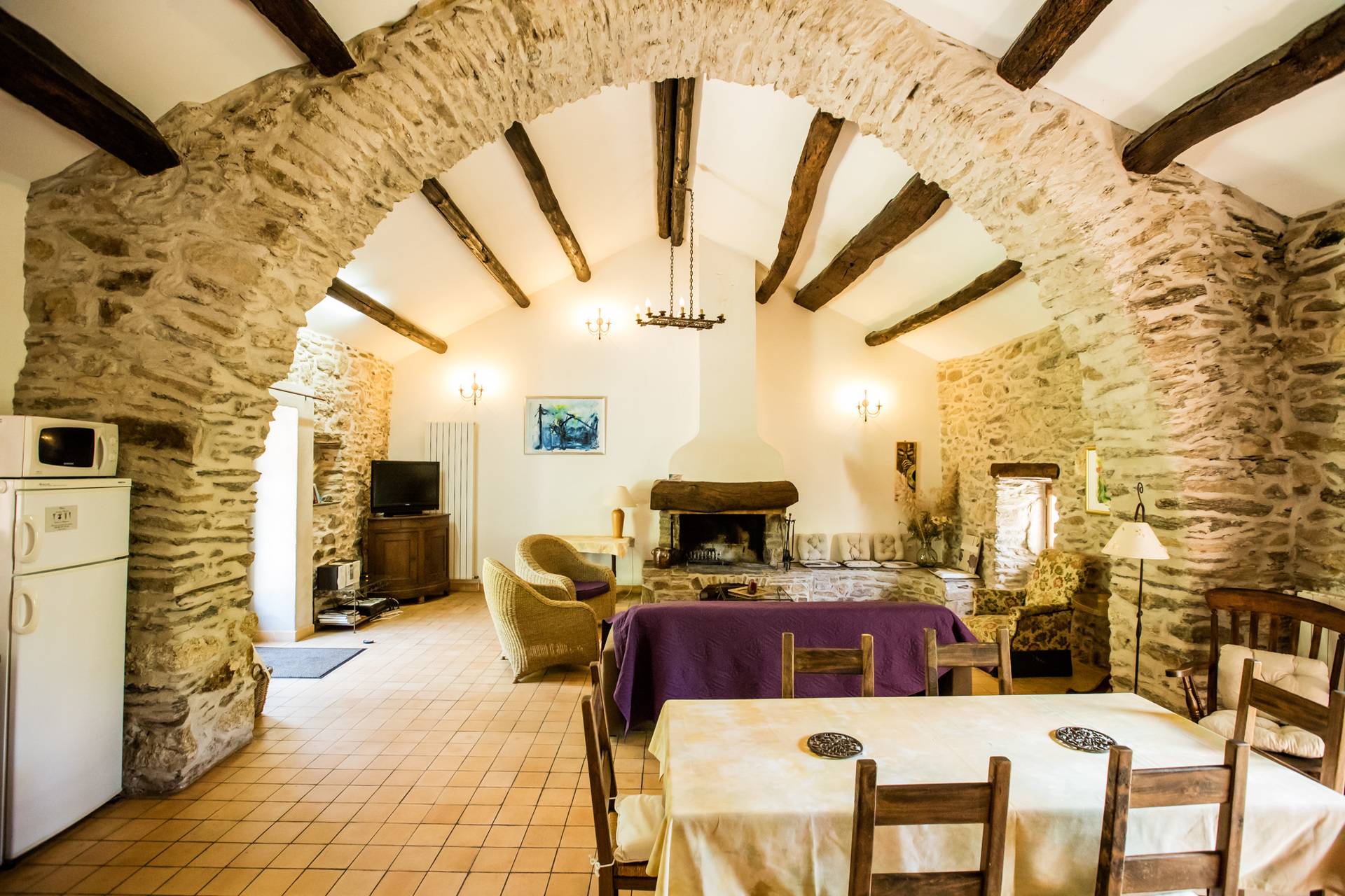Coin-cuisine/salle à manger avec une magnifique voûte en pierre et la charpente d'origine (60m²), toilettes et buanderie, une chambre avec 2 lits en 100cm et une seconde avec un lit « king size » en 200 cm