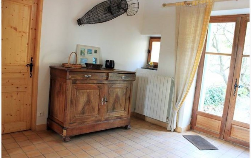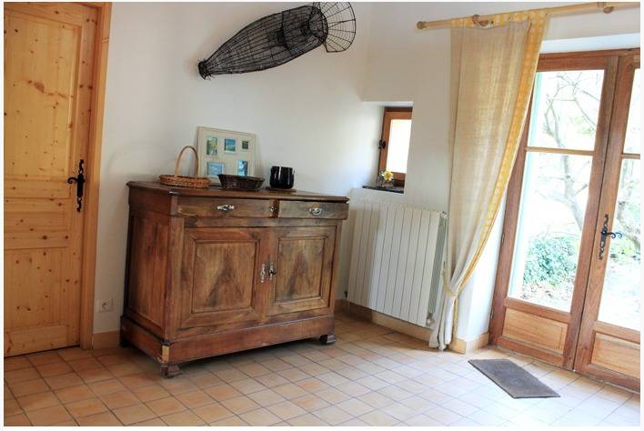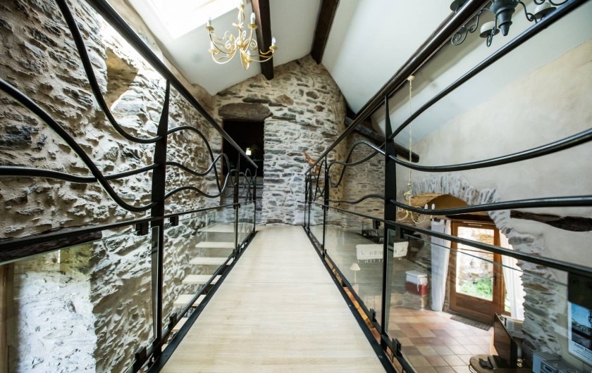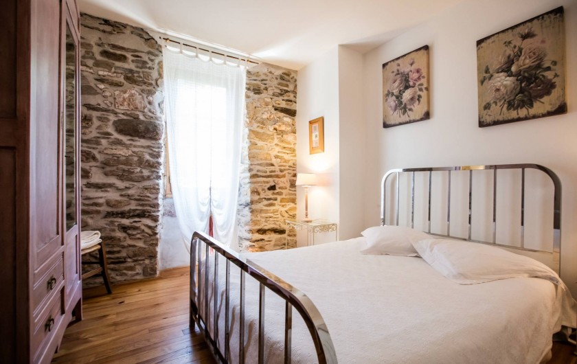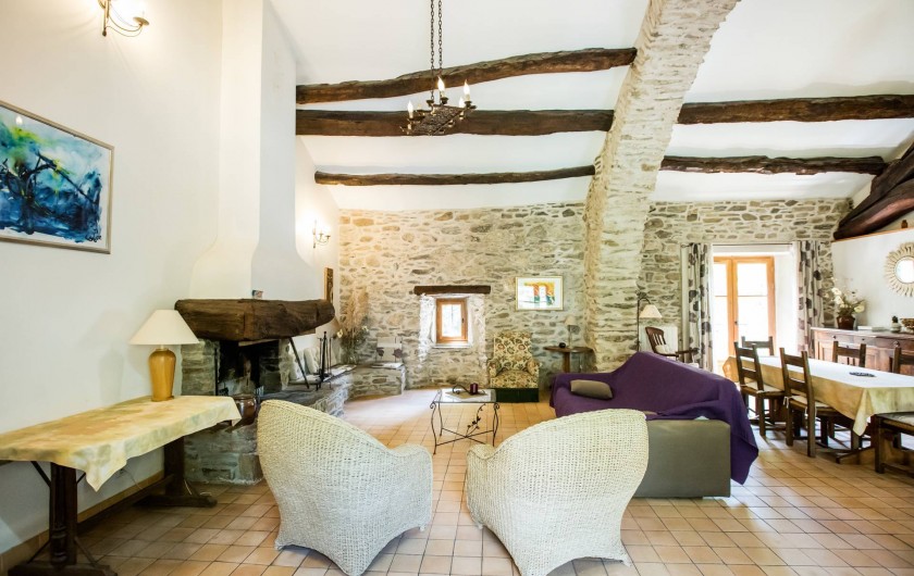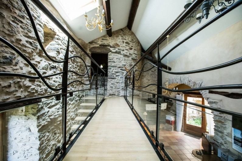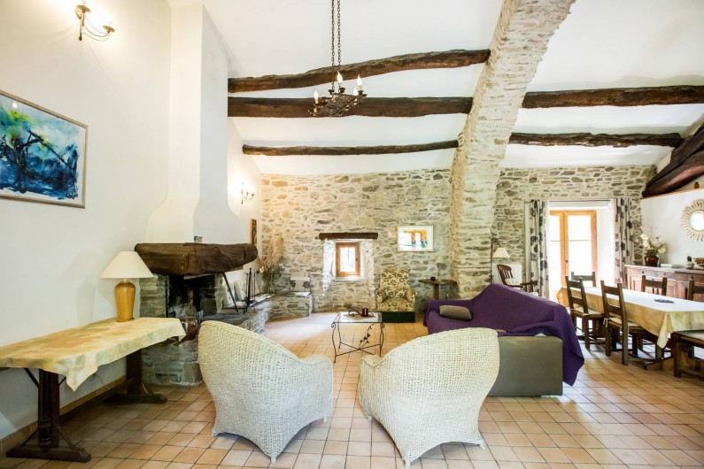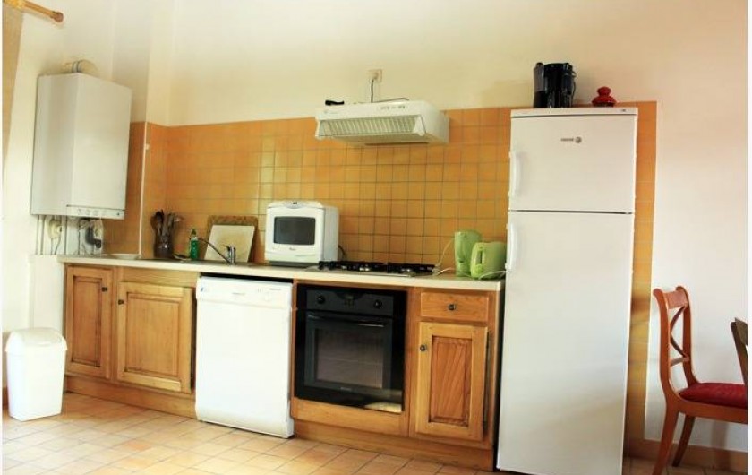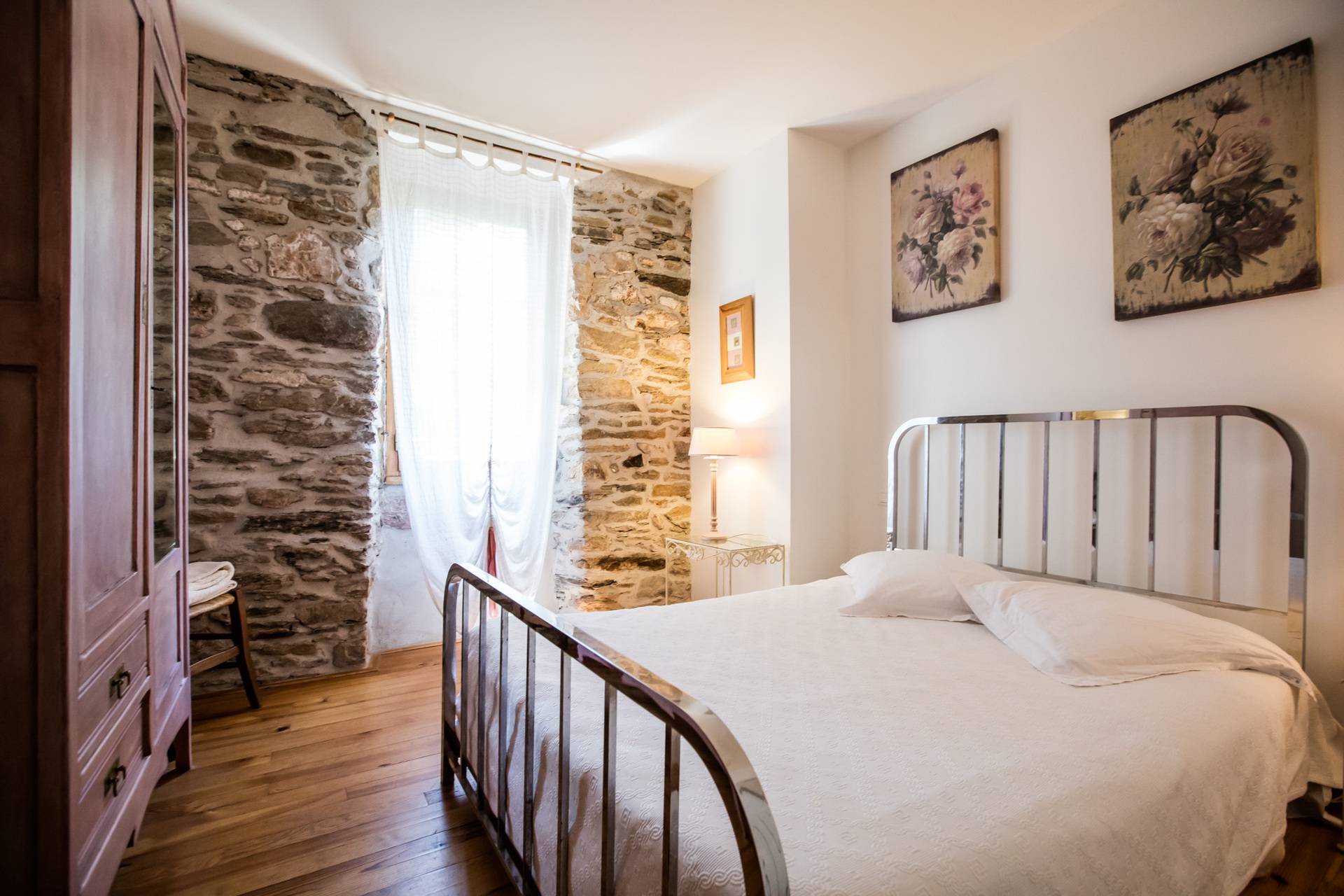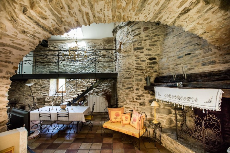 Coin-cuisine/salle à manger avec une magnifique voûte en pierre et la charpente d'origine (60m²), toilettes et buanderie, une chambre avec 2 lits en 100cm et une seconde avec un lit « king size » en 200 cm