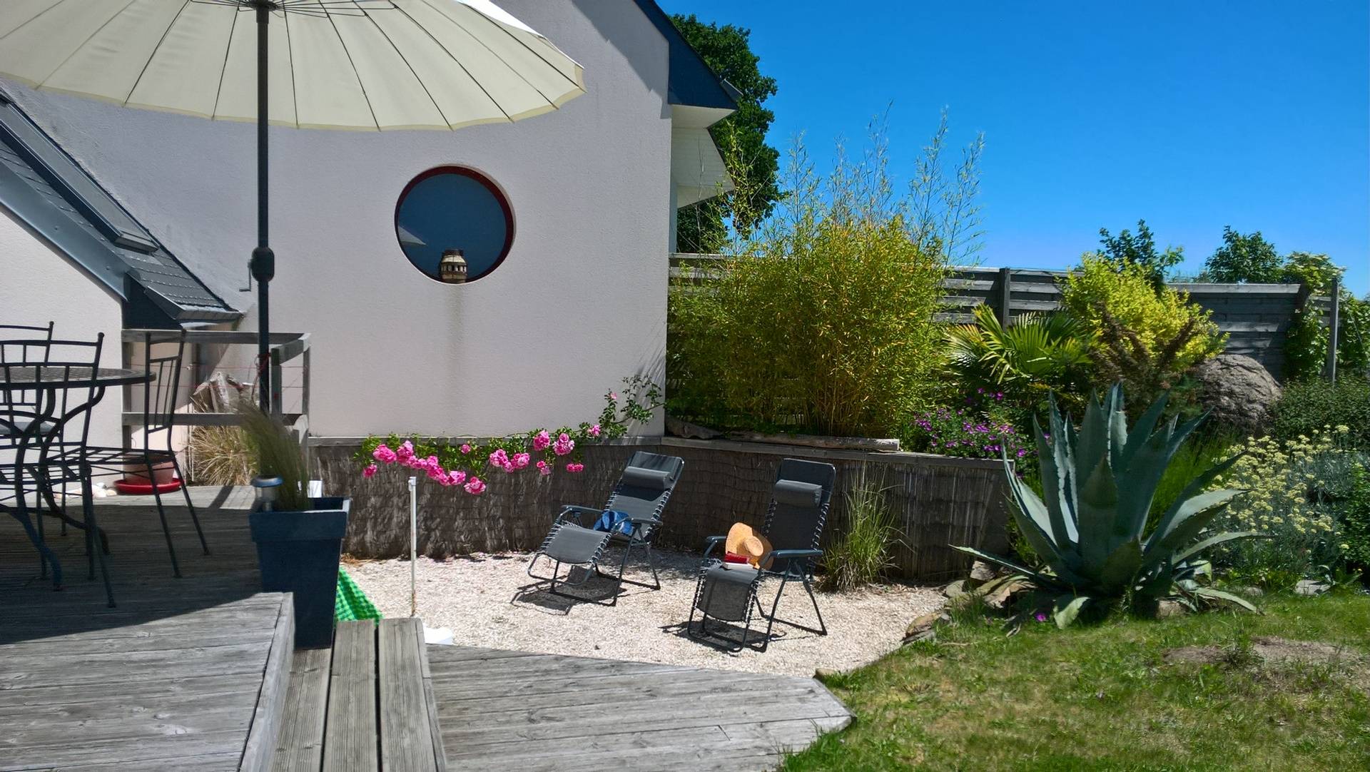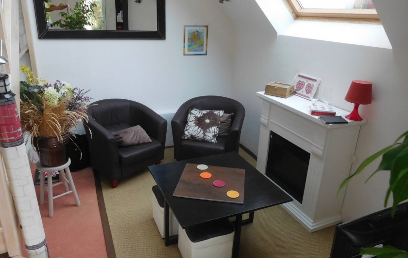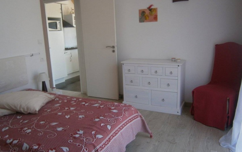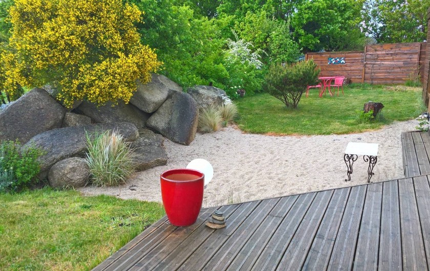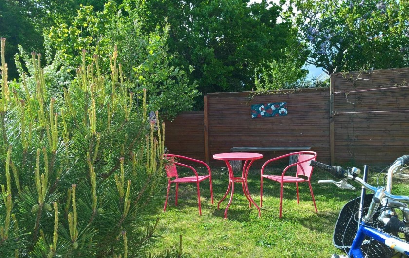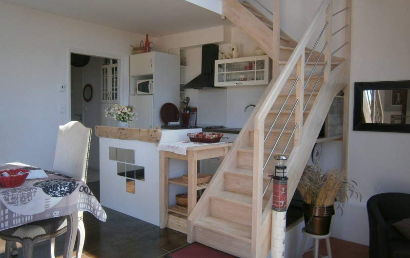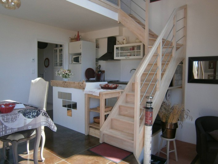 Gîte de plain pied. Maison mitoyenne, tout à fait indépendante. Cuisine ouverte sur séjour, salon en dénivelé, 1 chambre 1lit 2p avec salle d'eau, wc, grand cellier, grande mezzanine semi-fermée. Chauffage électrique. Jardin clos privatif (végétal et palissade) avec salons, barbecue et terrasse.