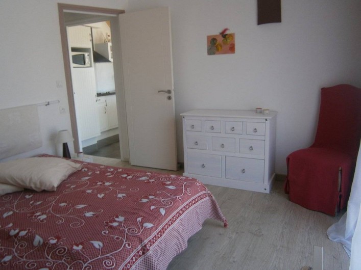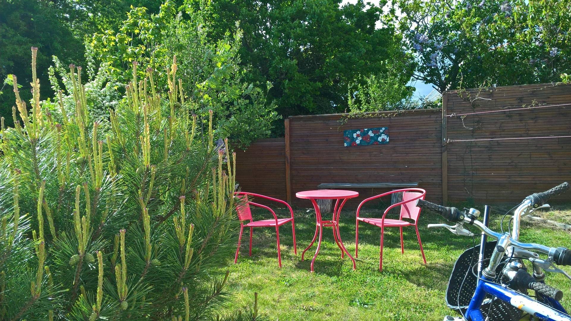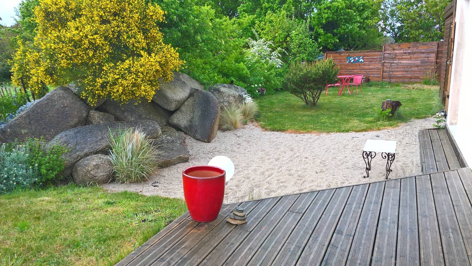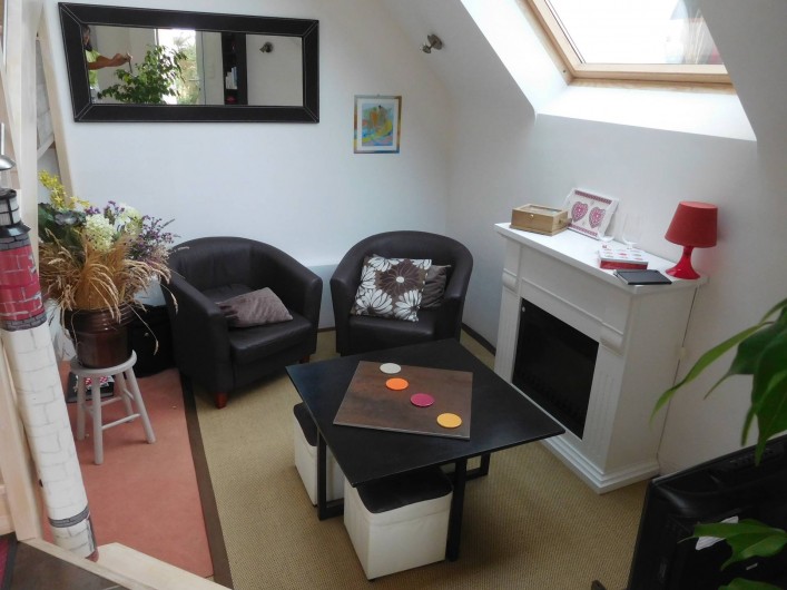 Gîte de plain pied. Maison mitoyenne, tout à fait indépendante. Cuisine ouverte sur séjour, salon en dénivelé, 1 chambre 1lit 2p avec salle d'eau, wc, grand cellier, grande mezzanine semi-fermée. Chauffage électrique. Jardin clos privatif (végétal et palissade) avec salons, barbecue et terrasse.