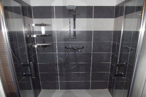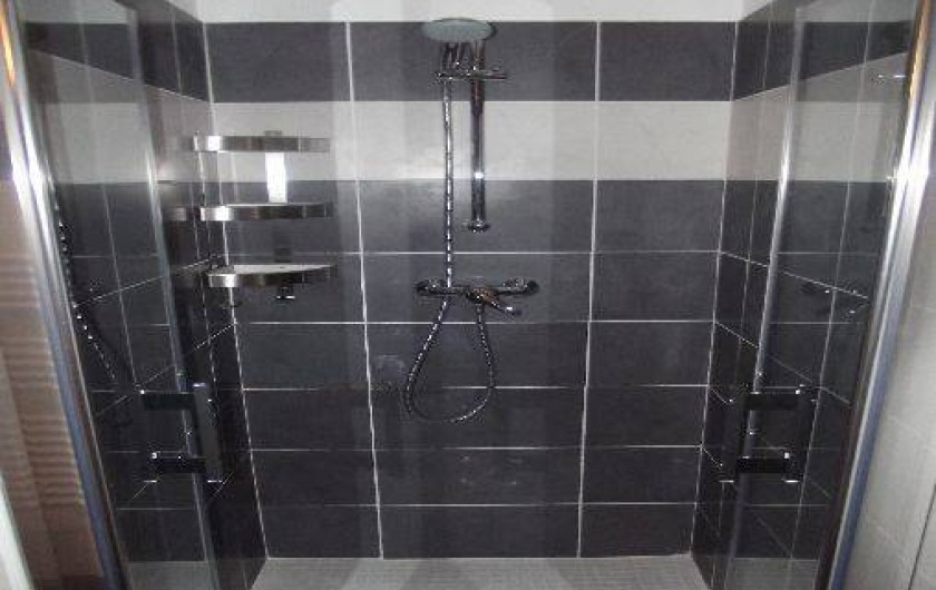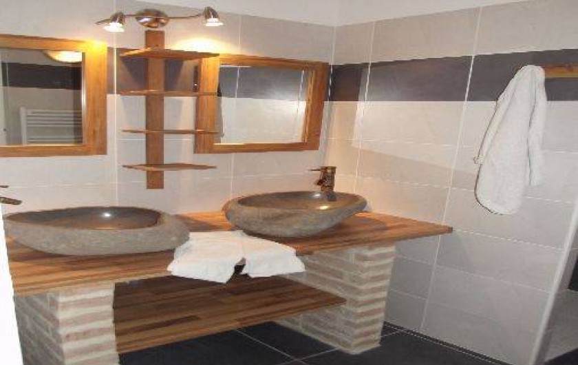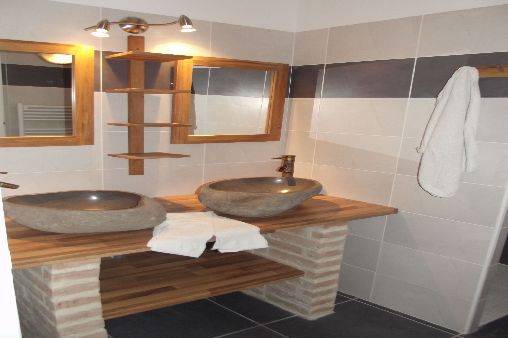 - salle de bain avec 2 vasques en pierre naturelles et une grande douche.
