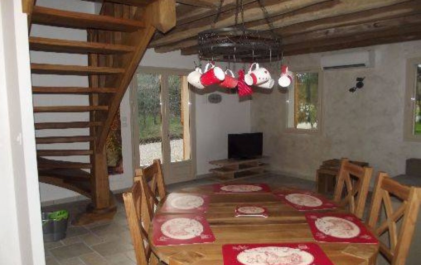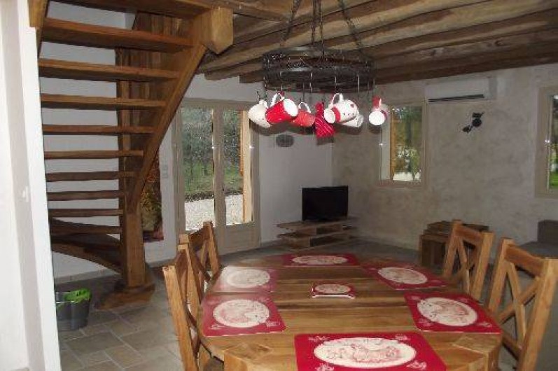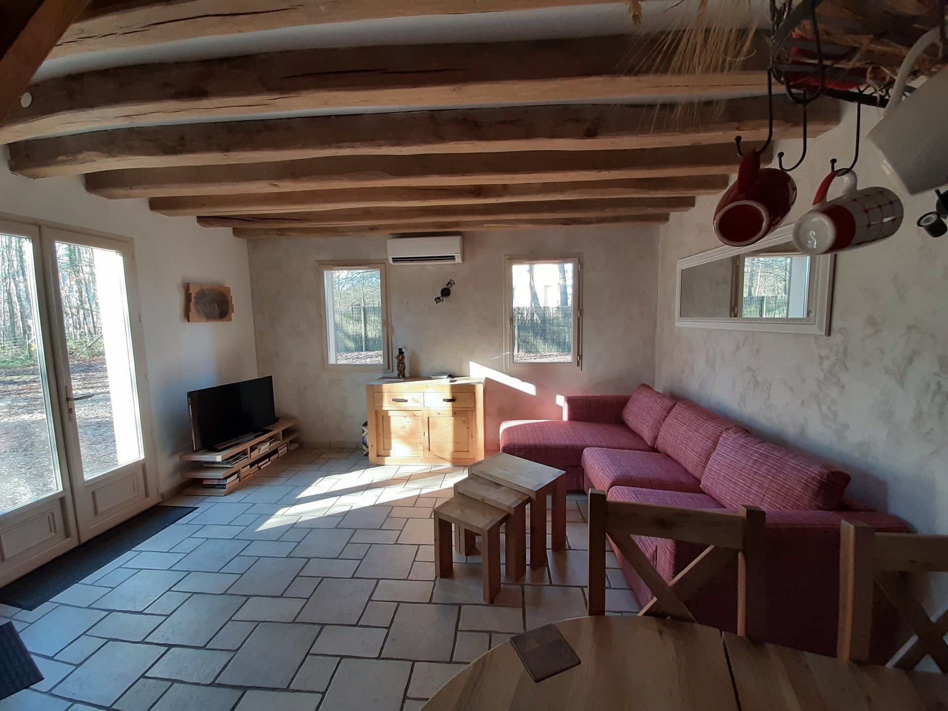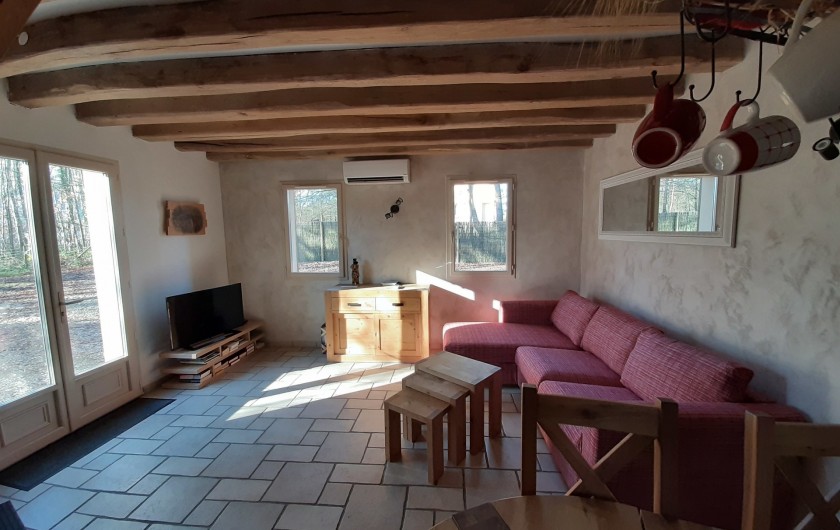 - une salle à manger (table de ferme) avec salon, canapé convertible 2 personnes. TV écran plat. Poutres et escalier en chêne caractéristiques de la Sologne.