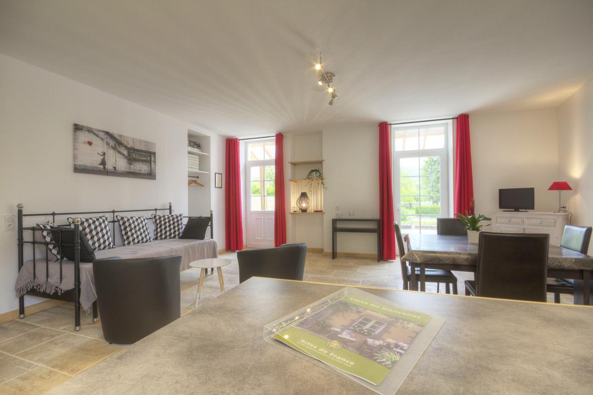 Vaste pièce à vivre lumineuse, avec dalles de Bourgogne au sol : salon (1 lit gigogne offrant 2 couchages d'appoint), salle à manger et cuisine intégrée ouverte. 1 chambre avec 1 lit de 160, 1 chambre avec 2 lits de 90 superposés, idéale pour des enfants, et une belle chambre avec un lit 160 et jacuzzi intégré. Une paroi coulissante entre la chambre et le jacuzzi permet de louer le gîte avec ou sans le spa, en