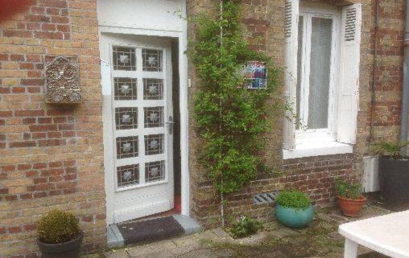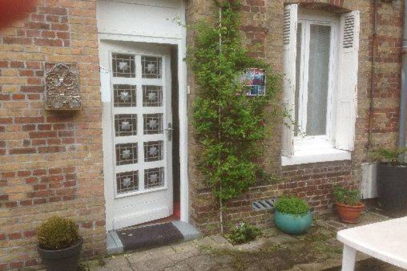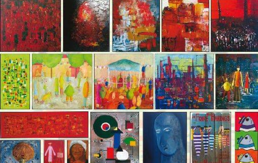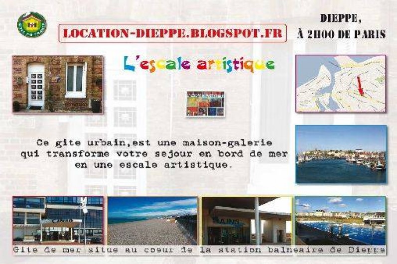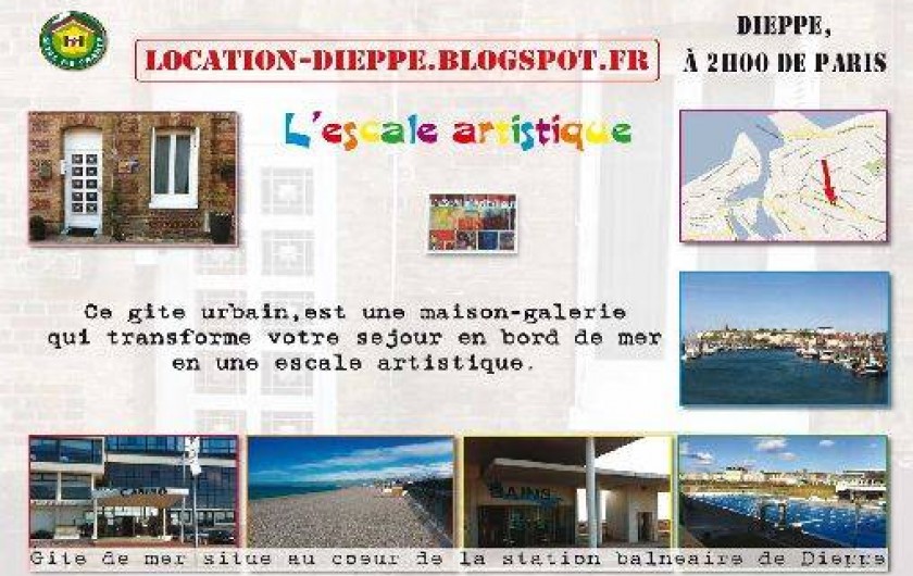 L'originalité de cette maison galerie où artistes peintres de tous horizons animent les murs du hall Gite de Mer à Dieppe. Cette maison de ville mitoyenne avec cour commune à deux autres logements (pas de pelouse), ouvre sur l'avenue qui traverse le quartier des pêcheurs et rejoint le centre-ville à travers ports. Là, marchés, magasins, musées, centre culturel, cinémas, piscine, restaurants, thalasso et plage !_Une excursion en Angleterre ? Ce gite urbain, pour 4 personnes, au Label "Gites de France" (2 épis)