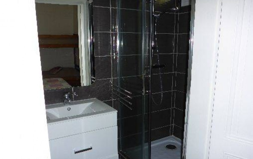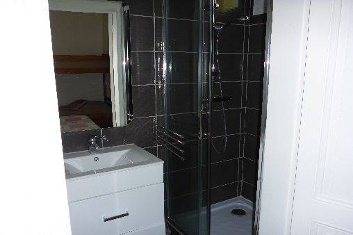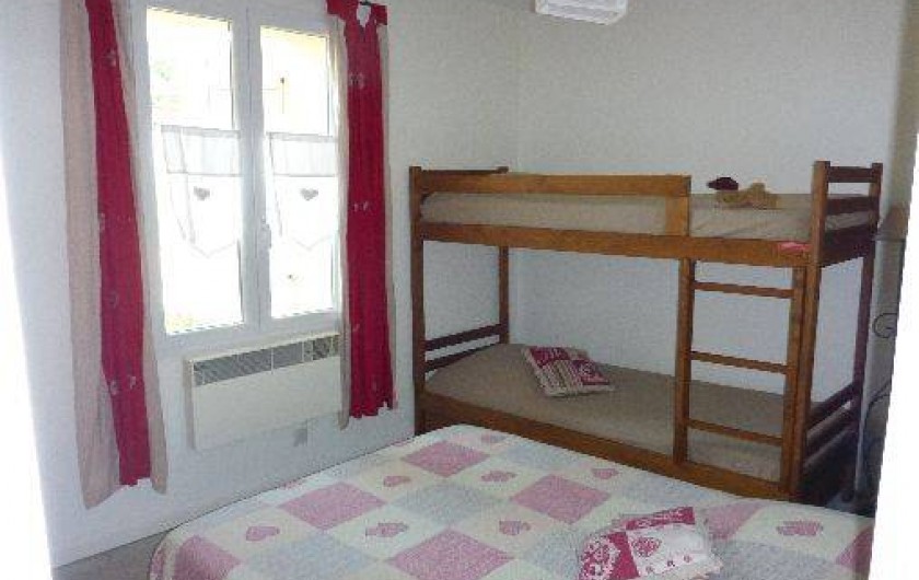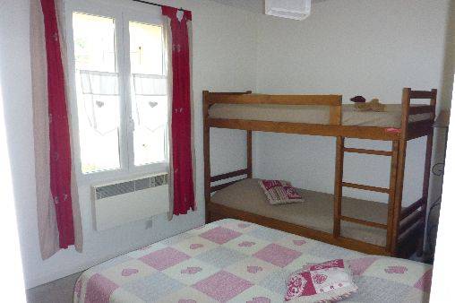 Une chambre avec un lit double, un lit superposé et sdb indépendante