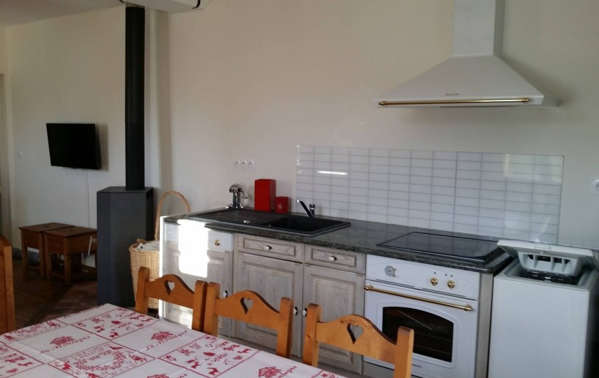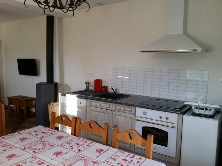Cuisine équipée d'un lave-vaisselle, lave-linge, plaques de cuisson vitrocéramique, four, frigo, Congélateur, télévision écran plat vaisselle pour 8