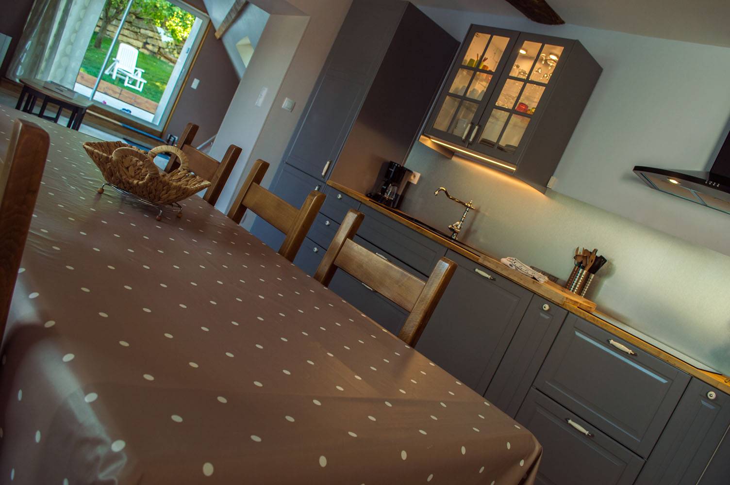 moderne et toute équipée (frigo,plaques vitro, four, micro-ondes, lave-vaisselle,...).