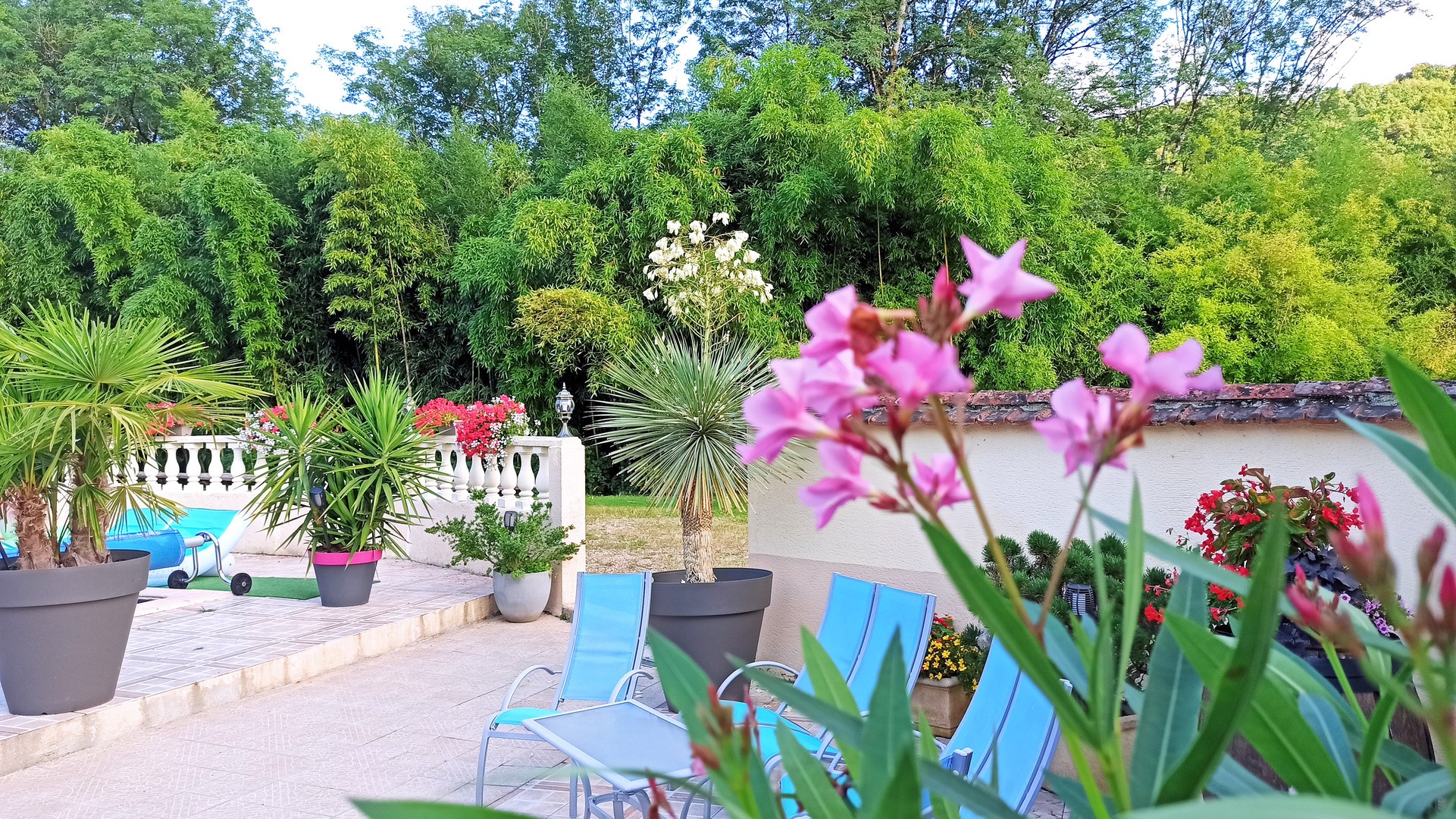 Piscine chauffée (de Mai à Septembre) de 10 x 5 m équipée d’un escalier balnéo sur une terrasse de 300 m² avec vue sur la bambouseraie centenaire.