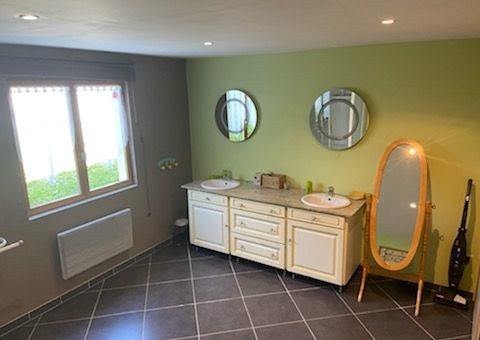 Grande salle d'eau( 24M2), 2 lavabos sur meuble, douche (220x90cm) + accessoires bébé( baignoire, pot, matelas à langer, chaise haute), lave linge, sèche linge, séchoir linge, fer et table à repasser, aspirateur.