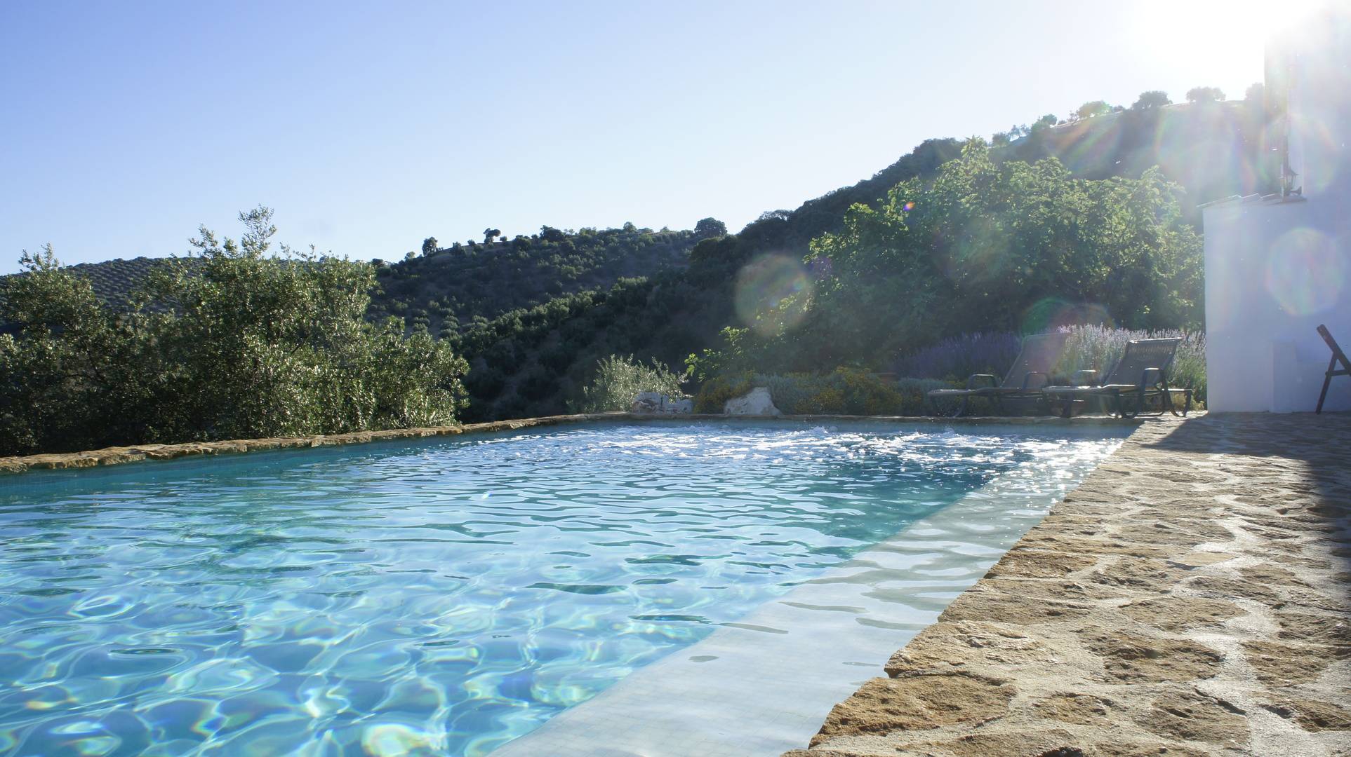 La piscine, placée au bord du patio, possède un rebord confortable juste dans l’eau où vous pouvez vous asseoir sans avoir trop chaud, tout en lisant ou en contemplant le panorama. On y trouve une cabine de douche extérieure avec WC et lavabo, donc si vous êtes bien installé au soleil vous n’avez pas à retourner à votre casita.