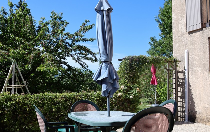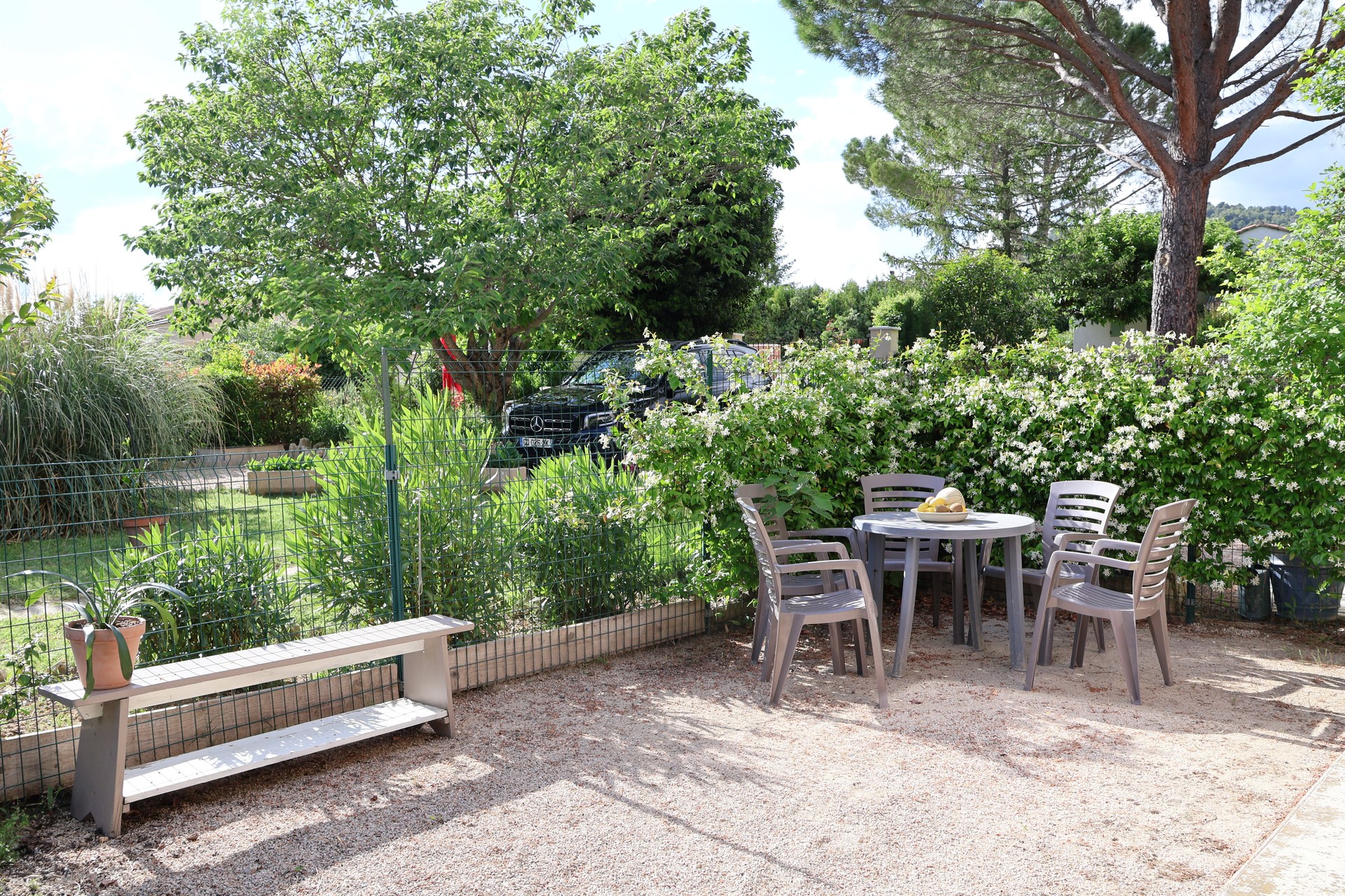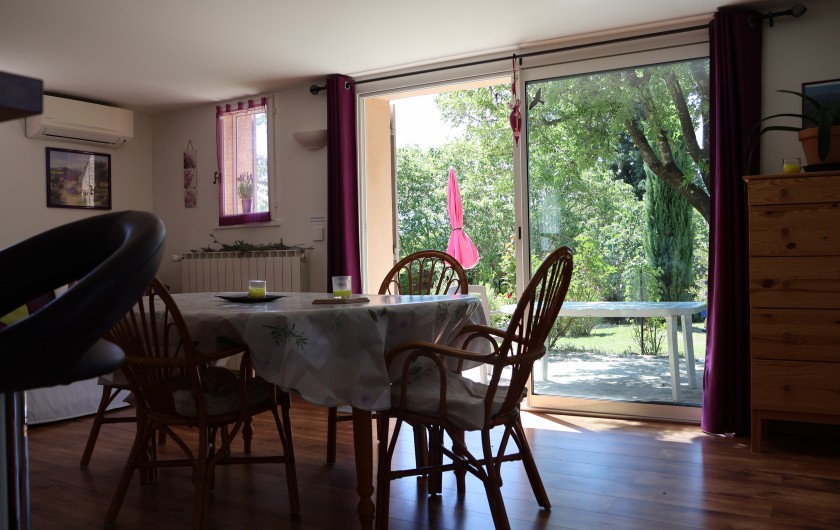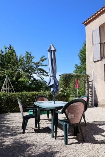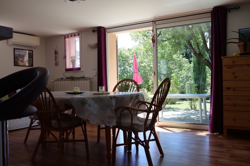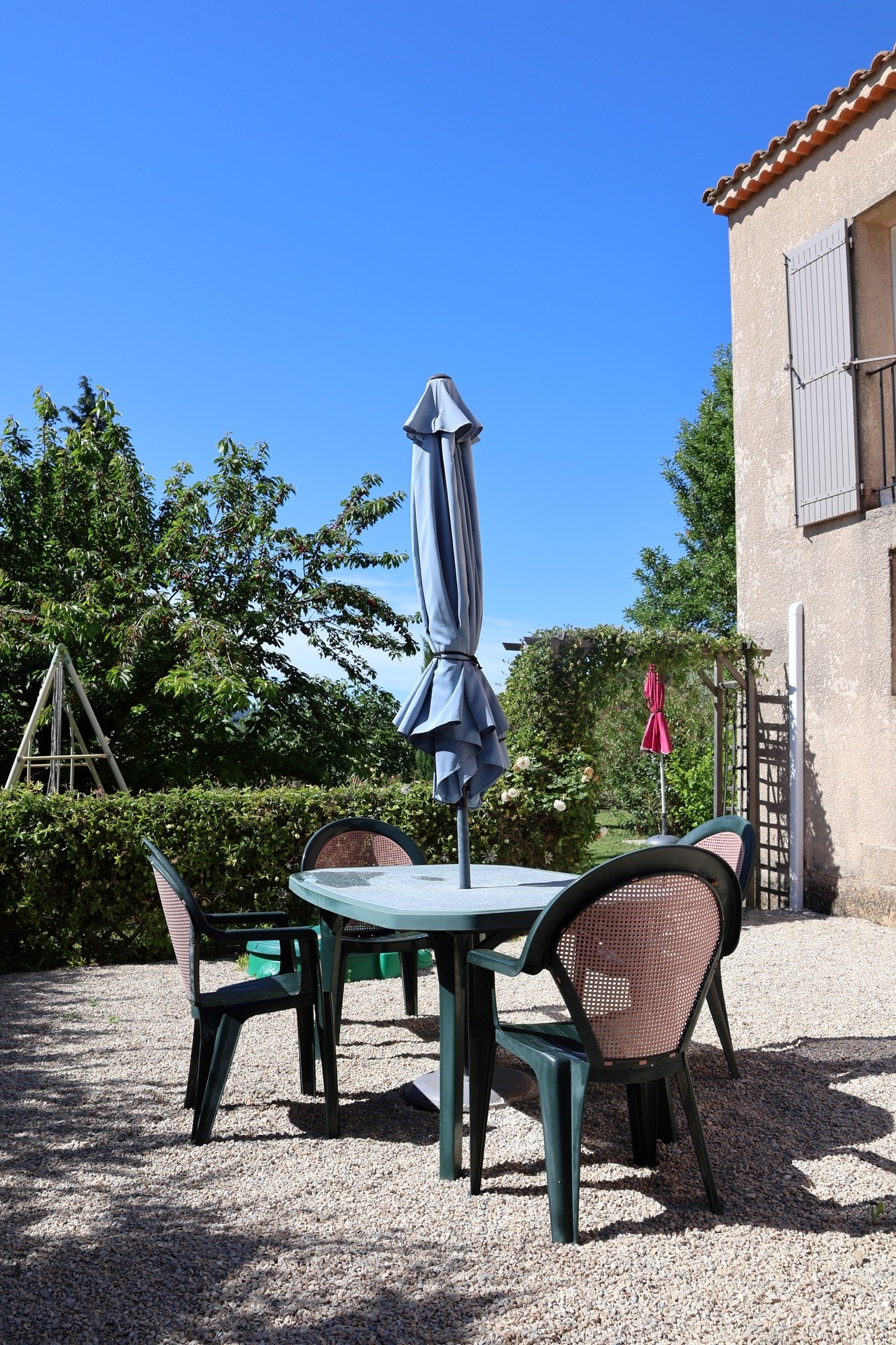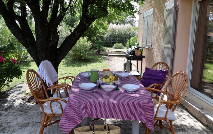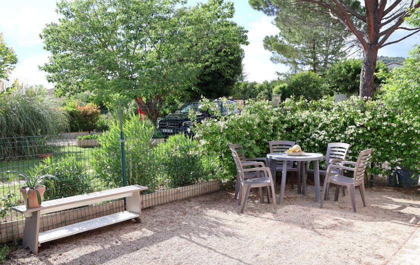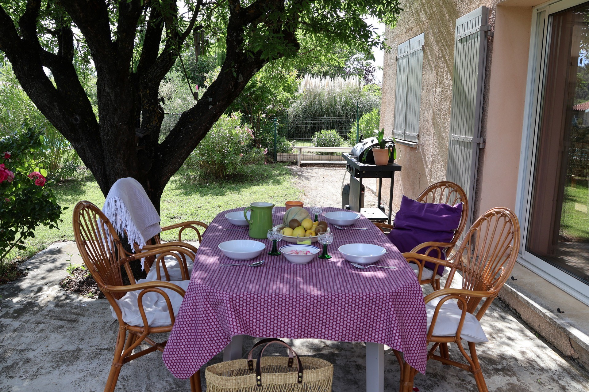 Terrasse ombragée plain pied avec le séjour et la cuisine ouverte