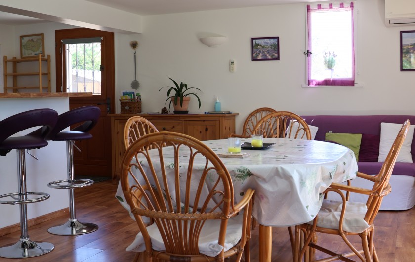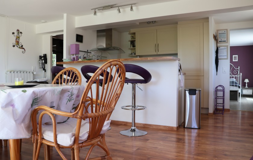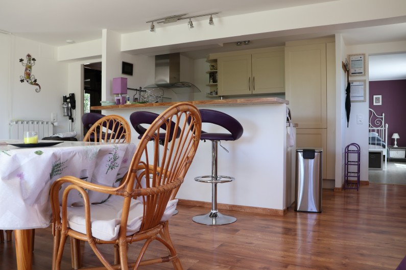 º Pièce de vie (25m²) climatisée avec cuisine américaine entièrement équipée (lave vaisselle, congélateur, réfrigérateur, micro-onde...) équipée d'une table et de 6 chaises+ un canapé lit