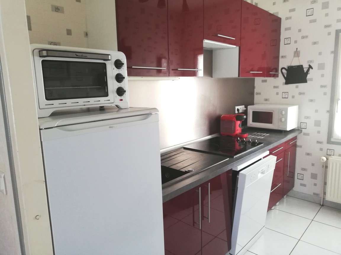 -Cuisine toute équipée (micro onde, réfrigérateur, four, plaque électrique, lave vaisselle, cafetière + Tassimo (expresso), grille pain, cuit vapeur, appareil a raclette, croque monsieur, gaufrier, robot)