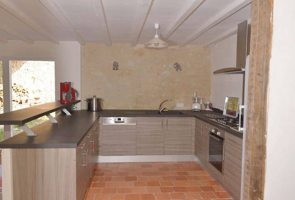 une cuisine américaine tout équipée , spacieuse communiquant directement sur la salle à manger, et sur une terrasse couverte de l'autre côté ,