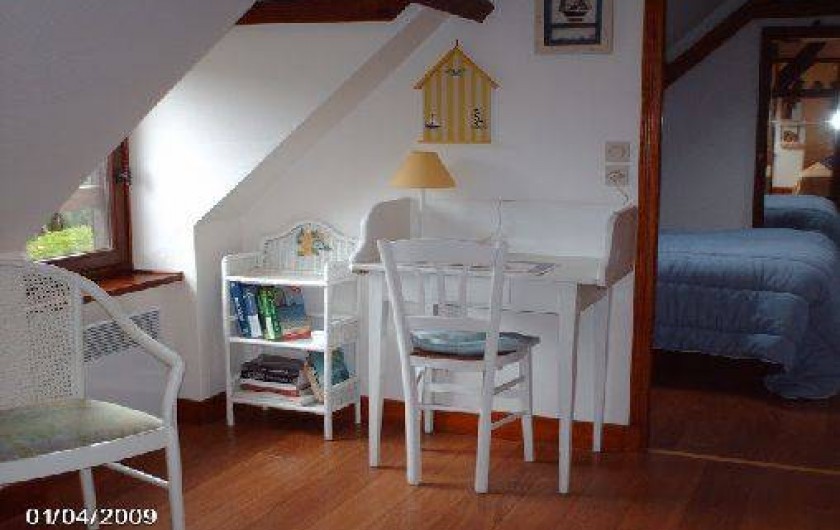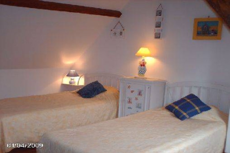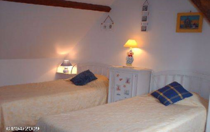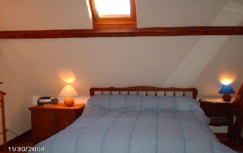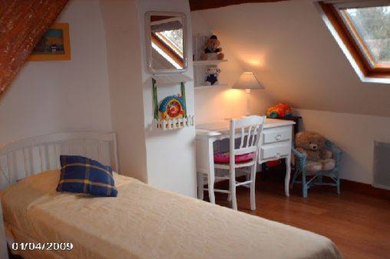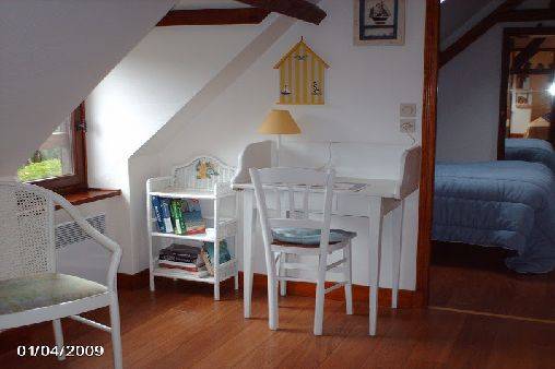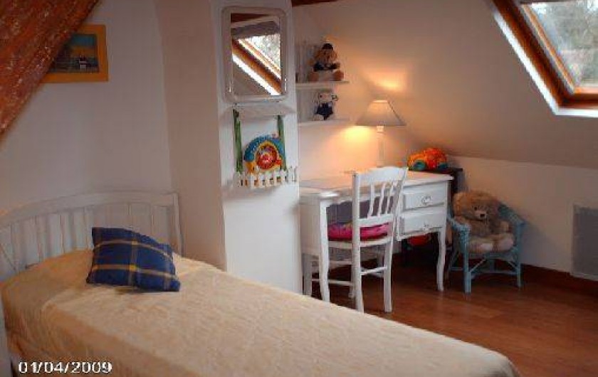 A l'étage, une chambre de 18 m2 avec 2 lits d'une personne, armoire, penderie, bureau, commode, coffre, lit bébé, matelat à langer et jouets.