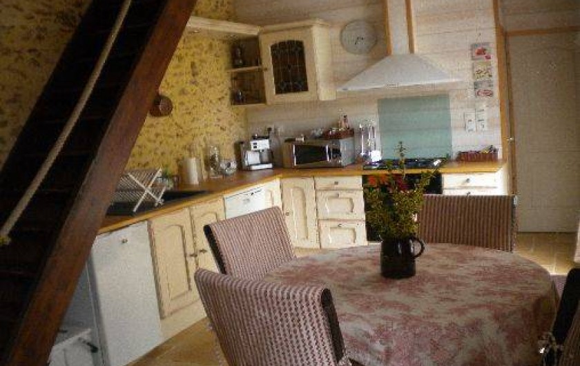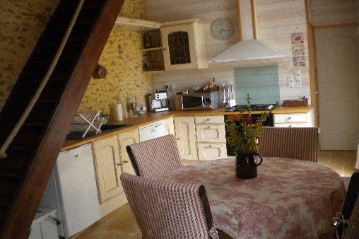 chaleureuse en bois blond, jardin privatif et équipement ménager complet.