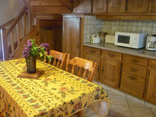 Au rez de chaussée se trouve un grand espace salon - salle à manger avec une cheminée à l'âtre (bois de chauffage offert) donnant sur une cuisine ouverte entièrement équipée pour mitonner les spécialités locales.