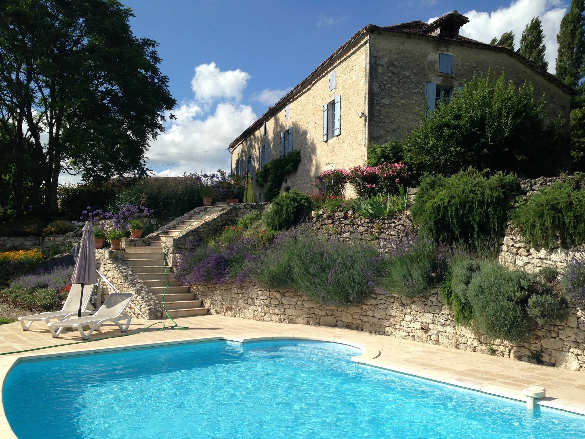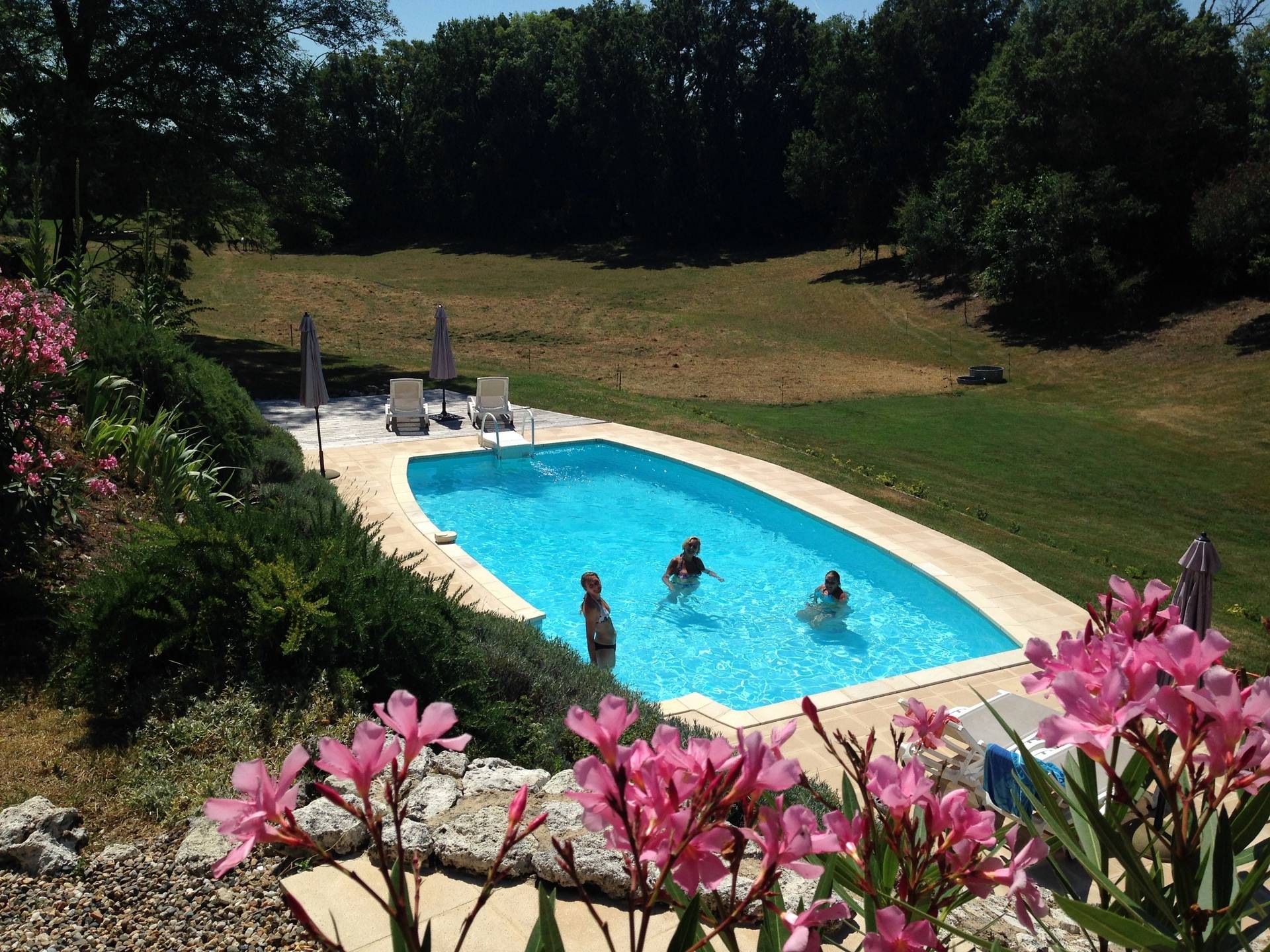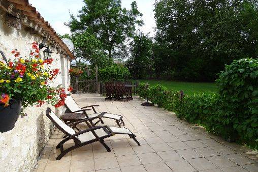 et une coiffeuse. Des portes donnent directement sur la grande terrasse (barbecue, table, chaises, parasol). La salle de bain est équipée à un niveau élevé avec WC, lavabo, radiateur sèche-serviette et une baignoire équipée d'une douche avec hydrothérapie. La terrasse donne sur les jardins qui mènent à notre mare aux canards et sa source, avec une superbe vue sur le vallon (10 hectares)