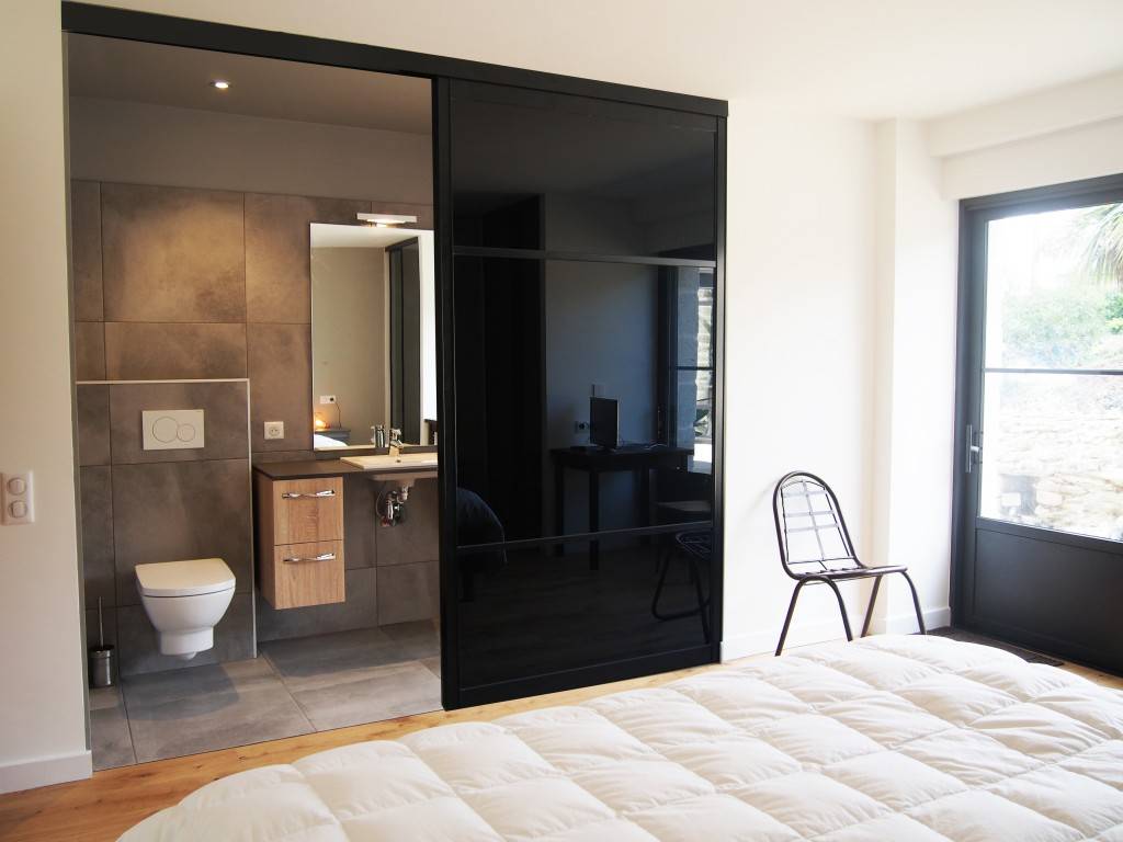 La salle de bain sépare de la chambre par des panneaux coulissants vous laissant libre choix sur son ouverture.
