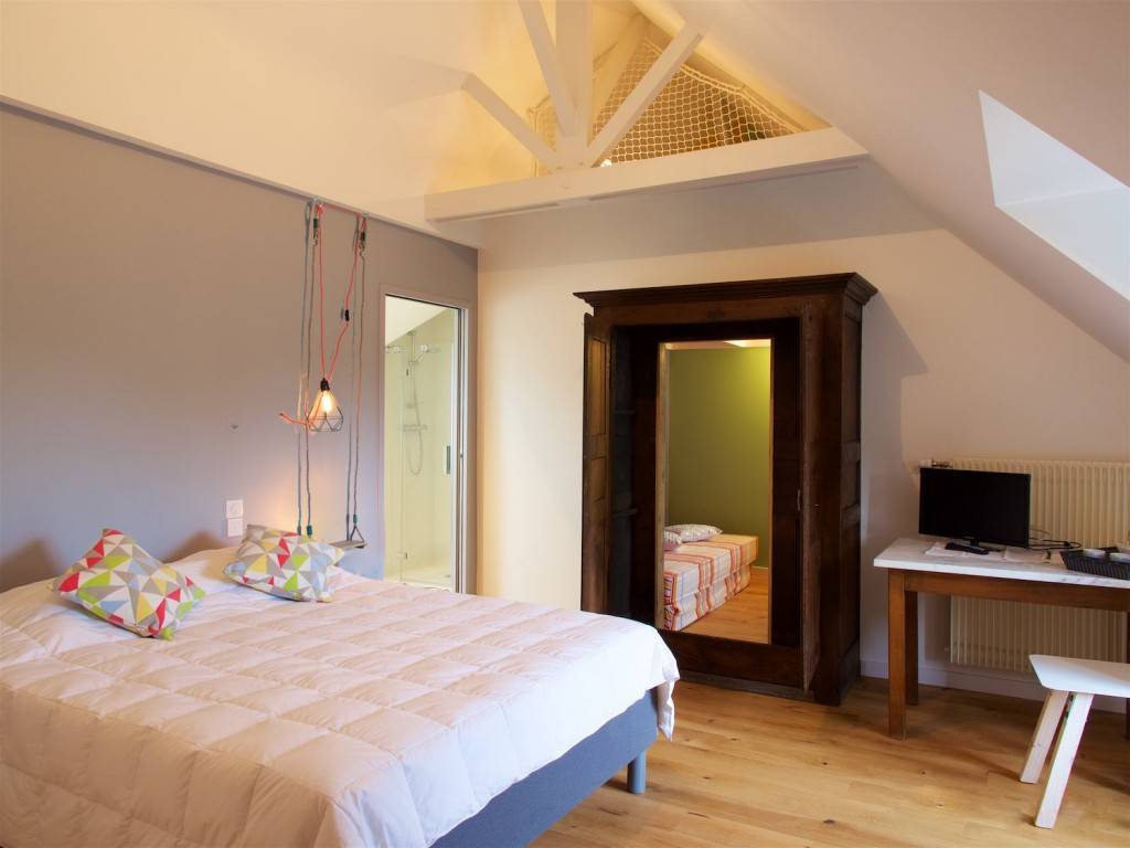 Par une entrée indépendante à l’étage, vous accéderez à cette chambre aménagée d’un lit double (160 x 200 cm) et de 2 lits d’une personne (0.80 x 1.90 cm), salle de douche et WC séparé, TV.