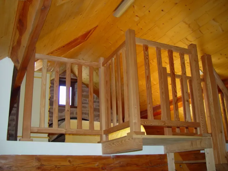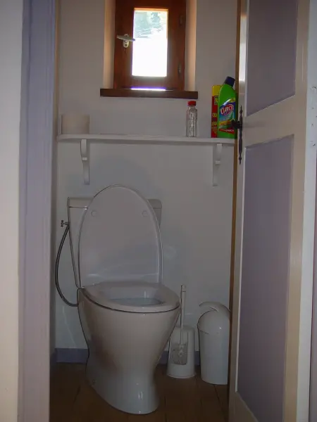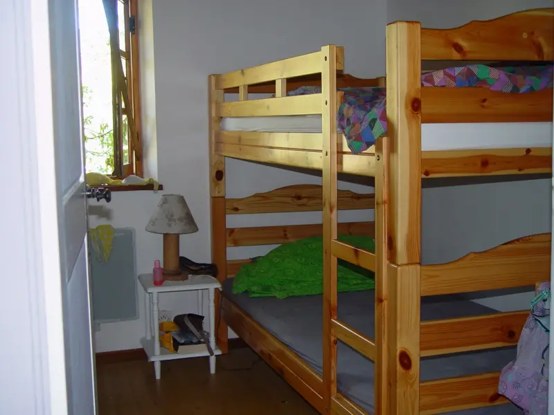 - Étage : une grande chambre avec lit 160 cm, armoire, commode + mezzanine avec lit 140 cm, semainier ; une chambre avec 2 lits 90 cm superposés, armoire murale, commode ; une salle de bain avec grande baignoire, lavabo + lave-linge, sèche-cheveux ; un WC séparé.