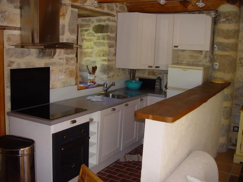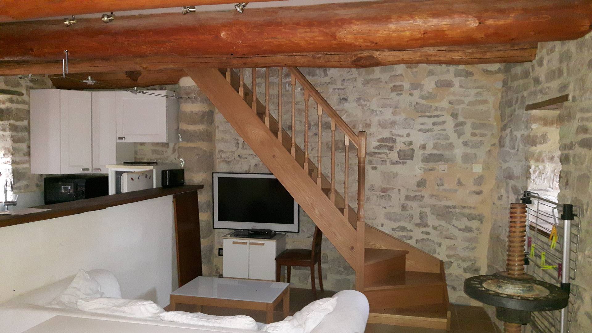 - Premier niveau : pièce à vivre composée d’un coin salle à manger avec cheminée (utilisable), d’un coin salon avec canapé (TV réception TNT + lecteur DVD) et d’une cuisine entièrement équipée (lave-vaisselle intégré, four intégré, plaques induction, hotte aspirante, micro-ondes, réfrigérateur/congélateur, cafetières, grille-pain, appareil à raclette).