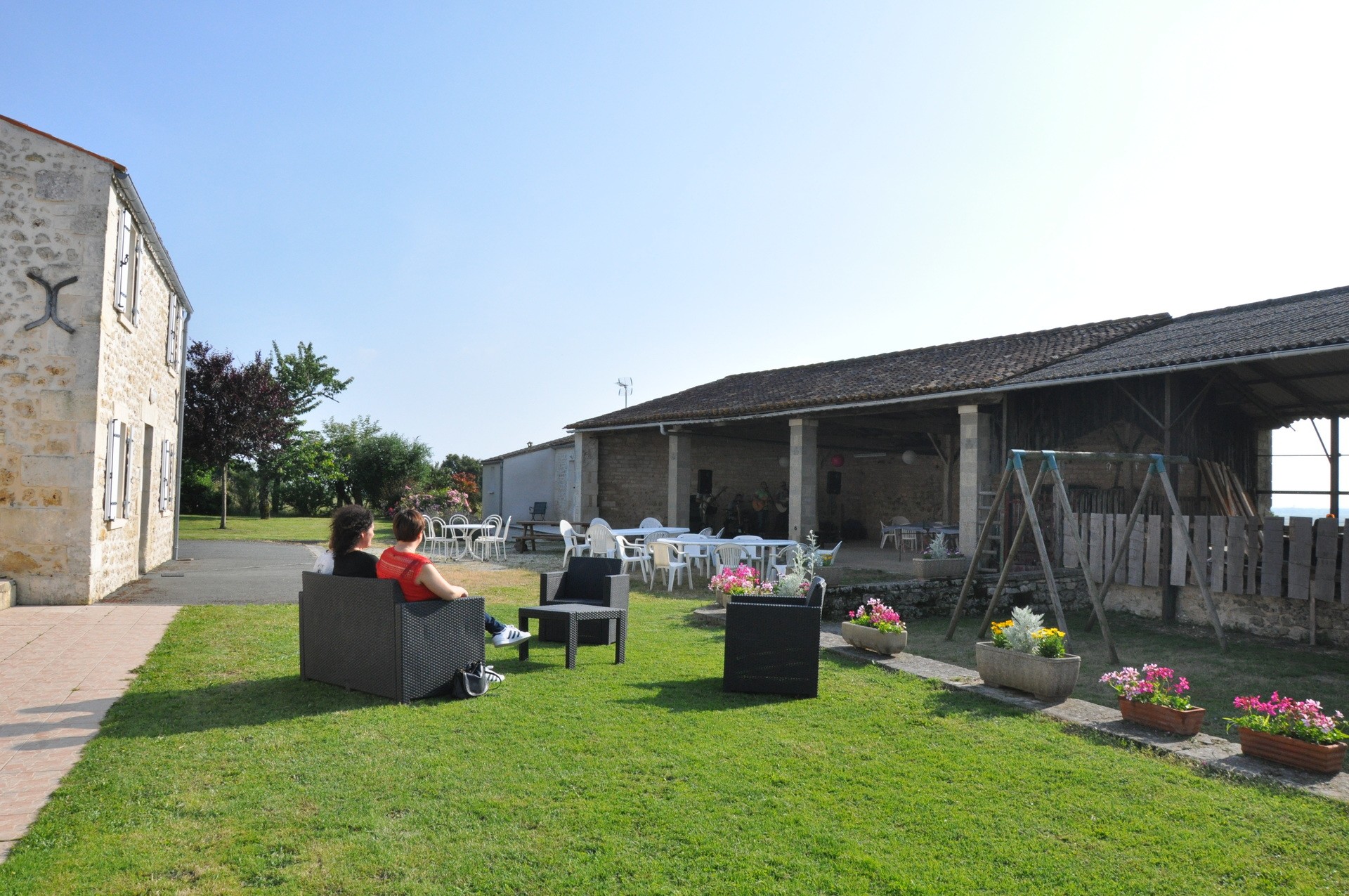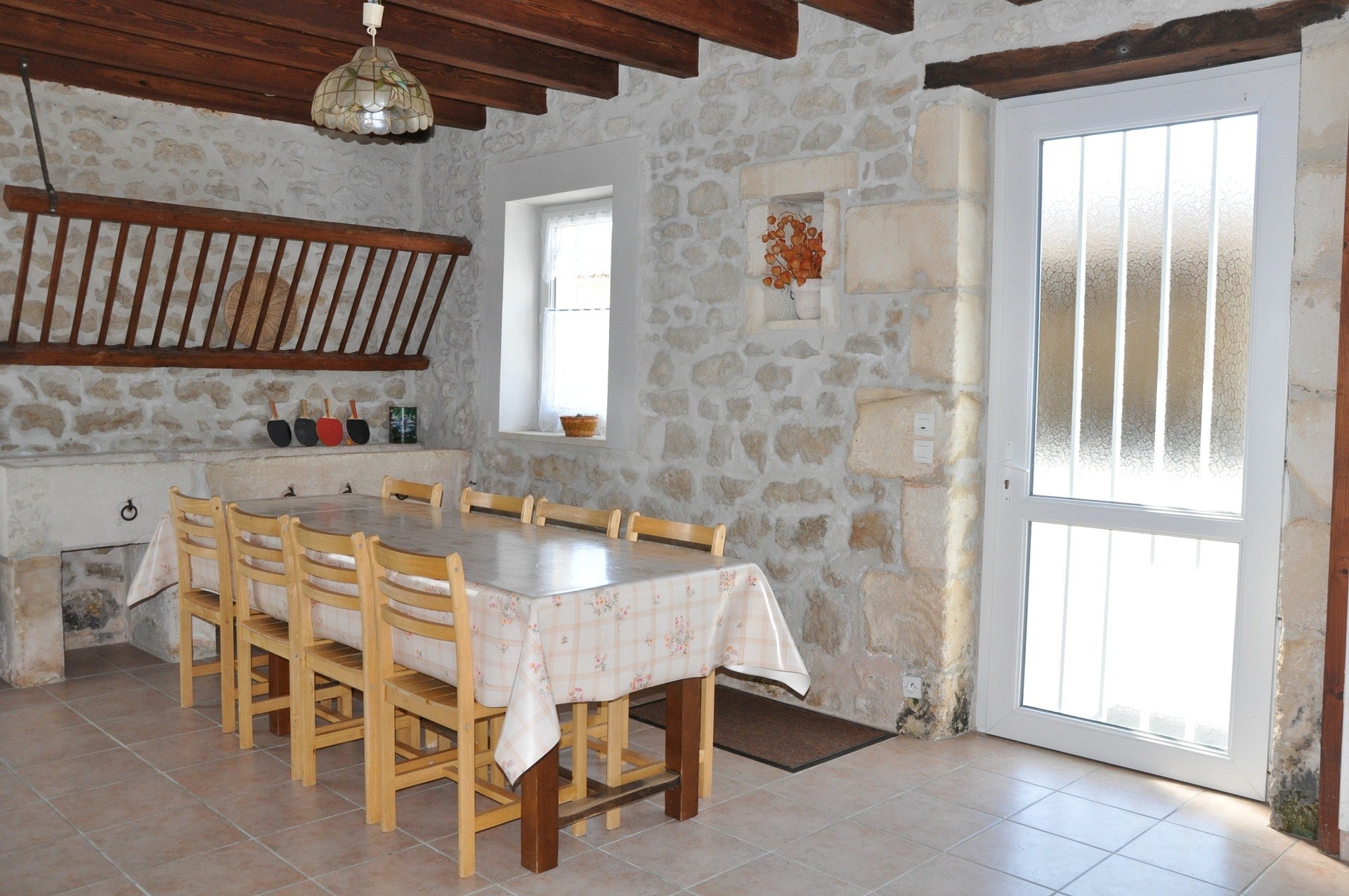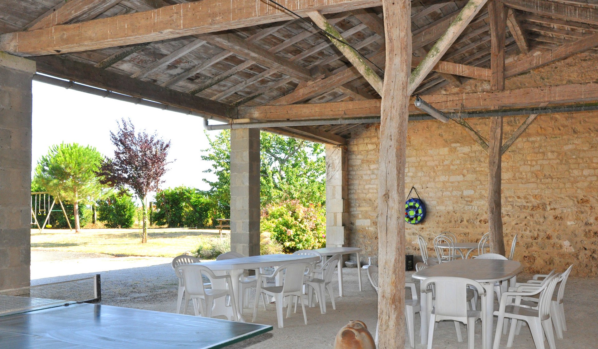 Il n'y a pas de salle commune prévue pour les repas mais il y a une grande grange ouverte très agréable aux beaux jours de laquelle vous pouvez profiter pleinement des espaces extérieurs (piscine, aire de jeux, barbecue, ...). Sinon les grands gites font 120 m2 chacun et la salle est très spacieuse, on peut y ajouter facilement des tables.
