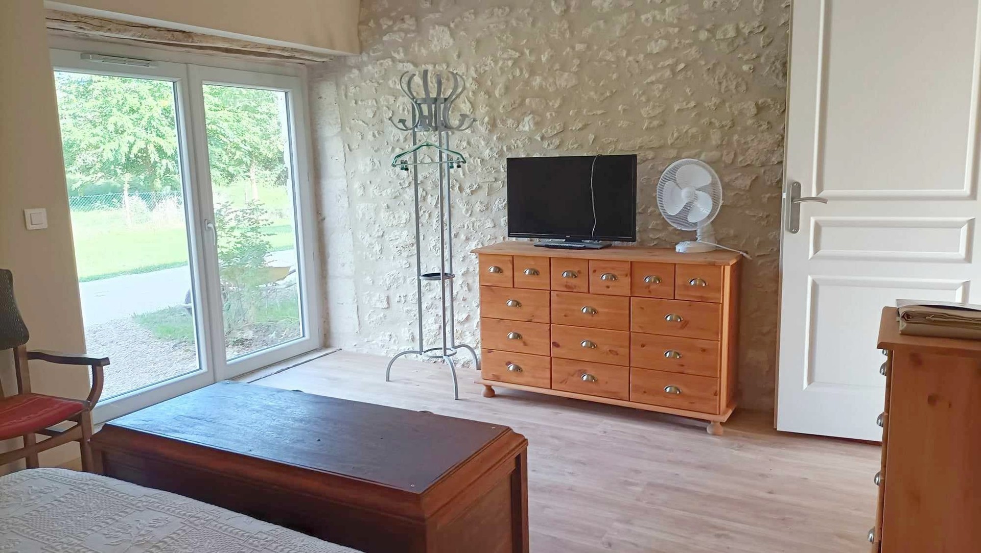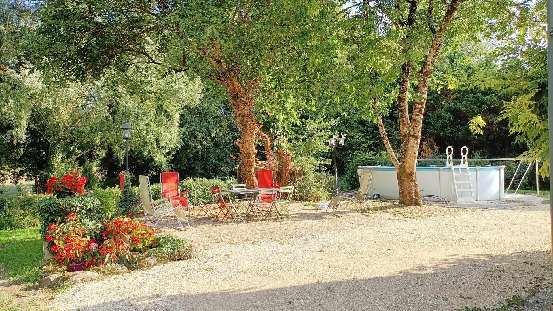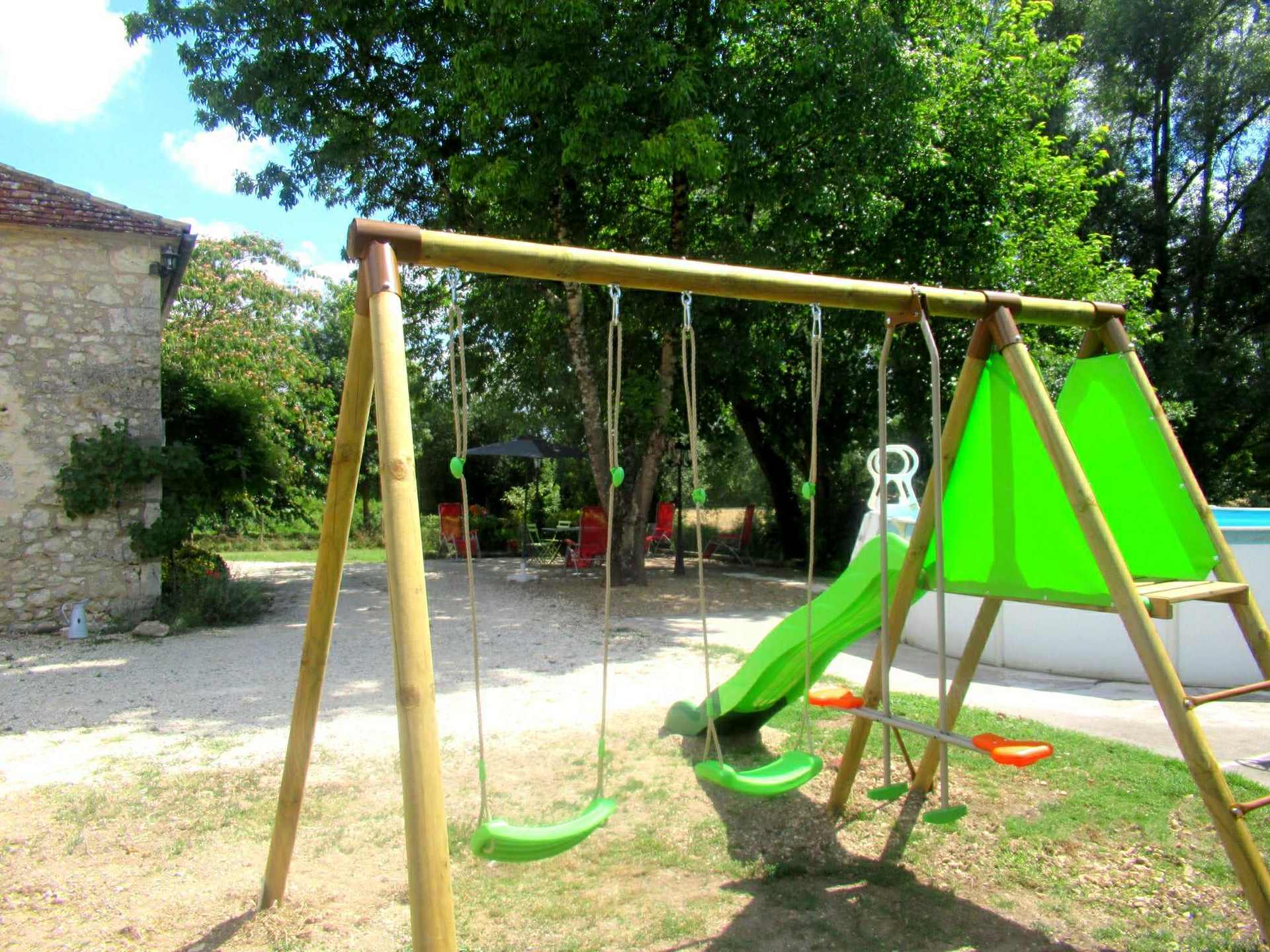 A l'extérieur: une terrasse ombragée ouverte et une deuxième terrasse couverte, avec transats, tables, chaises, BBQ, des balançoires pour les enfants ainsi qu'une piscine hors-sol (5,50 m de diamètre). Le terrain (environ 1200 m2) est clos et les animaux sont acceptés sur demande.