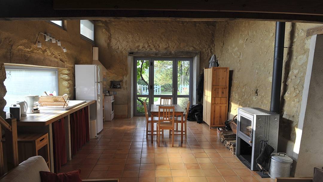 1 séjour- cuisine- salle à manger (35 m²) avec poêle cheminée à bois.