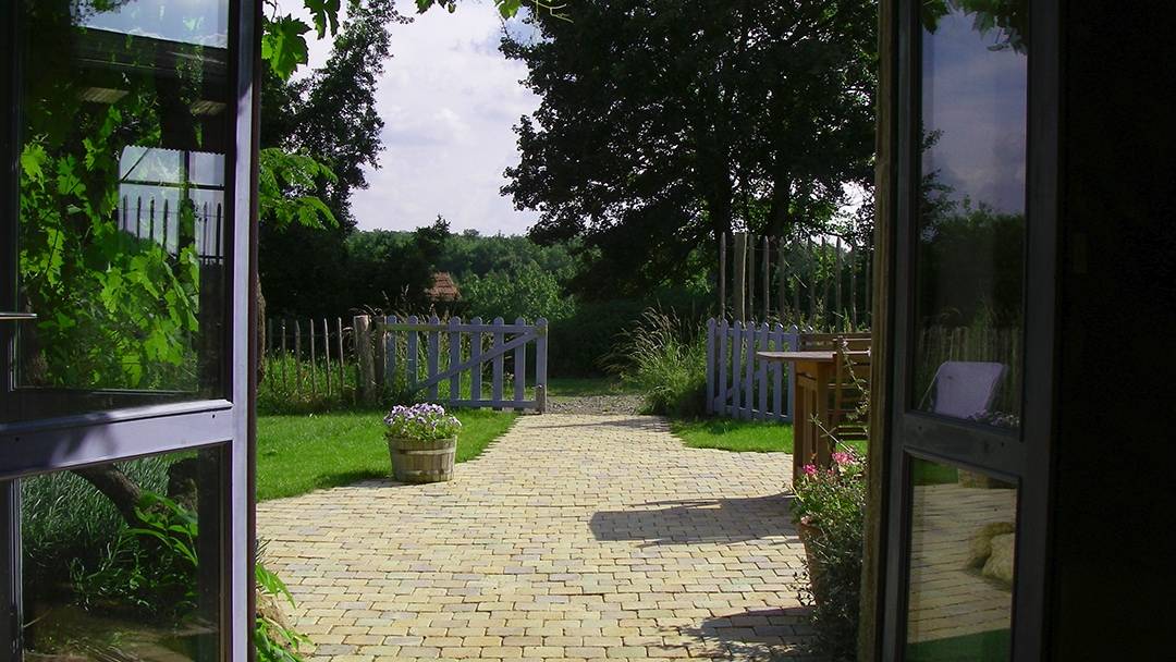 Porte–fenêtre donnant sur un jardinet privatif, (80 m²) équipé de mobilier de jardin.