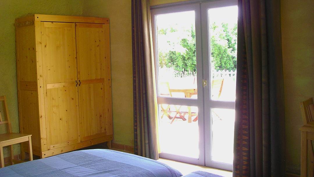 1 chambre 2 personnes (16 m²) avec porte-fenêtre vers le jardin.
