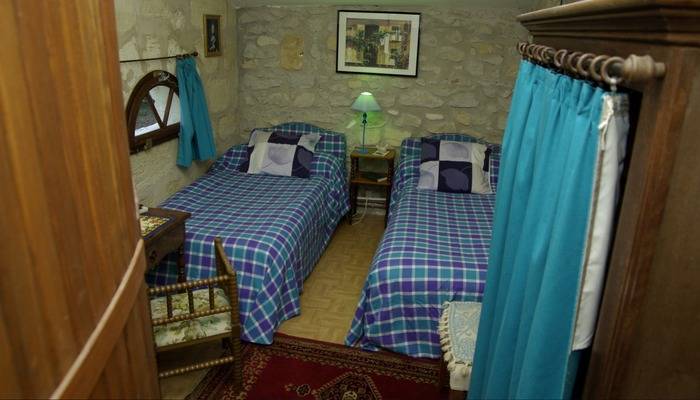 La chambre d'hôtes Ninon de l'Enclos (courtisane, femme d'esprit et écrivain du XVIIIème siècle), aux murs aux pierres apparentes, dispose de deux lits jumeaux et est parée d'un original coin salle de bain entouré d'un pressoir.