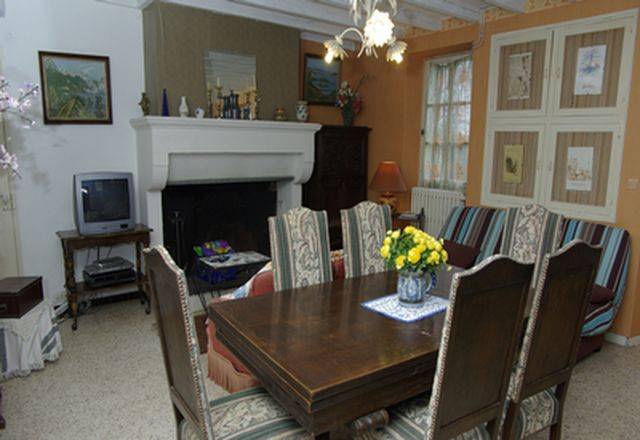 Grand salon, salle à manger, convivial et champêtre, avec canapé et fauteuils rassemblés devant la cheminée et la télé, avec TNT et lecteur DVD, se prêtant indifféremment aux repas, à la détente ou aux jeux. Elle dispose d'un canapé-lit.