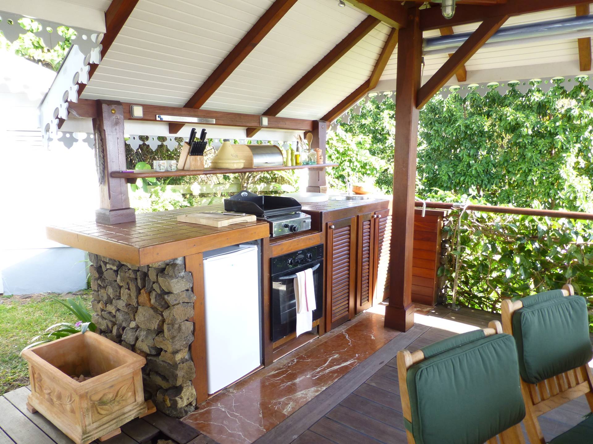 Au niveau du jardin, un carbet de 25 m2, avec cuisine équipée, plancha, plaque induction, et tout le nécessaire pour faire la cuisine.